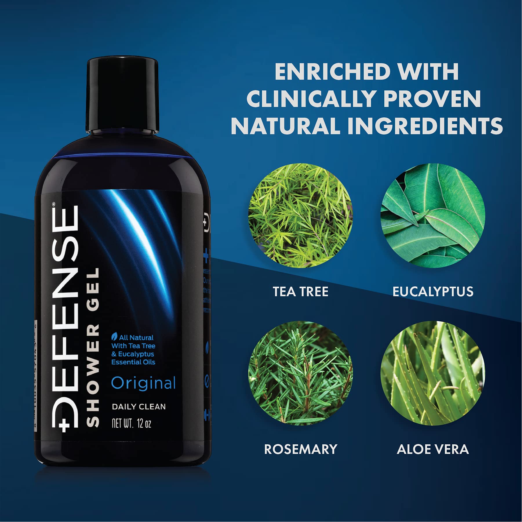 Details: Defense Body Wash provides full strength natural essential oils PROVIDES A BROAD SPECTRUM OF BENEFITS DERIVED FROM TEA TREE OIL AND EUCALYPTUS OILSCLINICALLY PROVEN NATURAL INGREDIENT effective at helping wash away bacteria, viruses, and fungusPROVEN IN THE WORLD OF CONTACT SPORTSEFFICIENTLY REMOVES dirt, grime, gym crud, sweat, smog, allergens, grunge, and built up oilsHIGHEST QUALITY. Formulated for quality, consistency and longevityHIGH DENSITY LATHER for deep cleansing poresSUPERIOR RINSING action RESTORES THE SKIN'S natural barrier and helps controls the production of sebum and dead skin cellsPERFECT FOR ACTIVE LIFESTYLES supports proper hygiene routines. Recommended after workouts.NATURAL DEODORIZING INGREDIENTS helps wash away odor causing bacteriaHYPOALLERGENIC eucalyptus scentSAFE for sensitive skinNATURAL, FREE & CLEAR. NO FRAGRANCES, DYES, COSMETICS, PETROCHEMICAL COMPOUNDS, TRICLOSAN, ALCOHOL OR SODIUM LAURYL SULFATE.MADE in the USAWhy Australian Tea Tree Oil and Eucalyptus Oil? Australian tea tree oil and eucalyptus oils have been shown to be effective against all three categories of infectious organisms: bacteria, fungus and viruses. Australian tea tree oil is an effective natural deodorizer and cleaner Australian tea tree oil has been approved by European government authorities and included in the European Pharmacopoeia. Claims regarding the medical properties of tea tree oil are not sanctioned by the US authorities or the FDA.