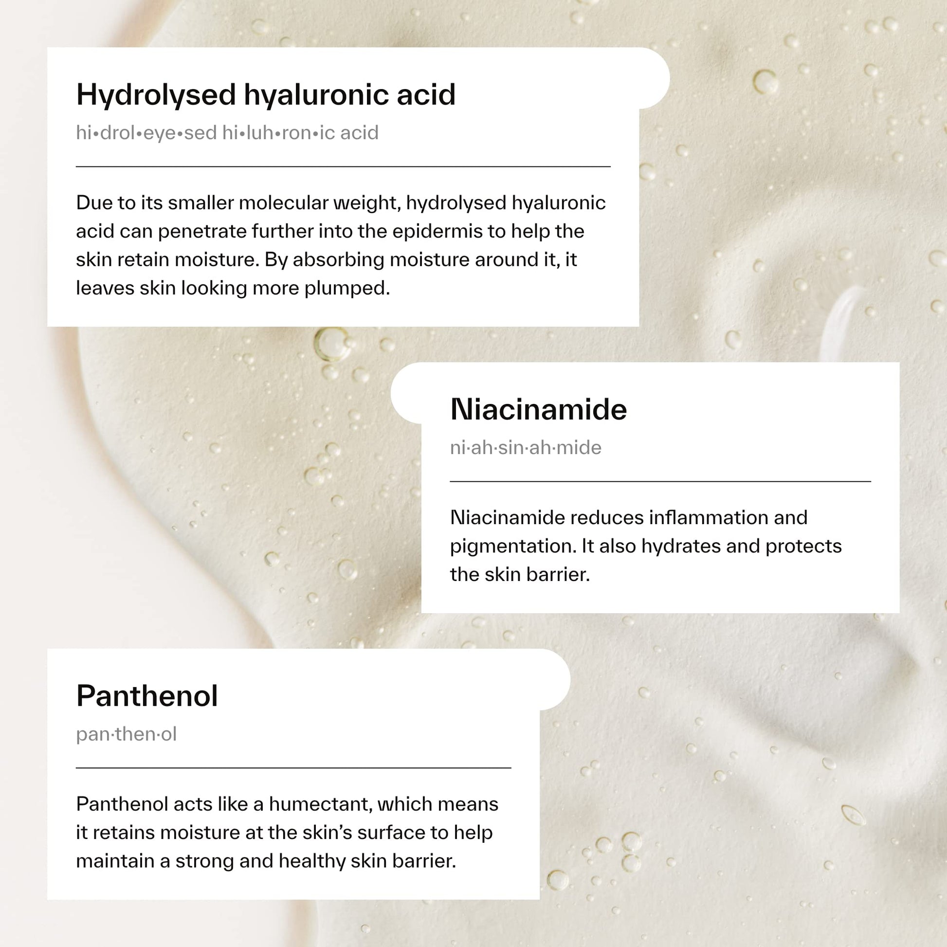 - Contains Hydrolyzed Hyaluronic Acid, Glycerin, Niacinamide and Vitamin B5 to hydrate, plump and nourish your skin, leaving it smoother and reducing wrinkles while strengthening your skin’s barrier. Helps soften the appearance of fine lines & wrinkles
