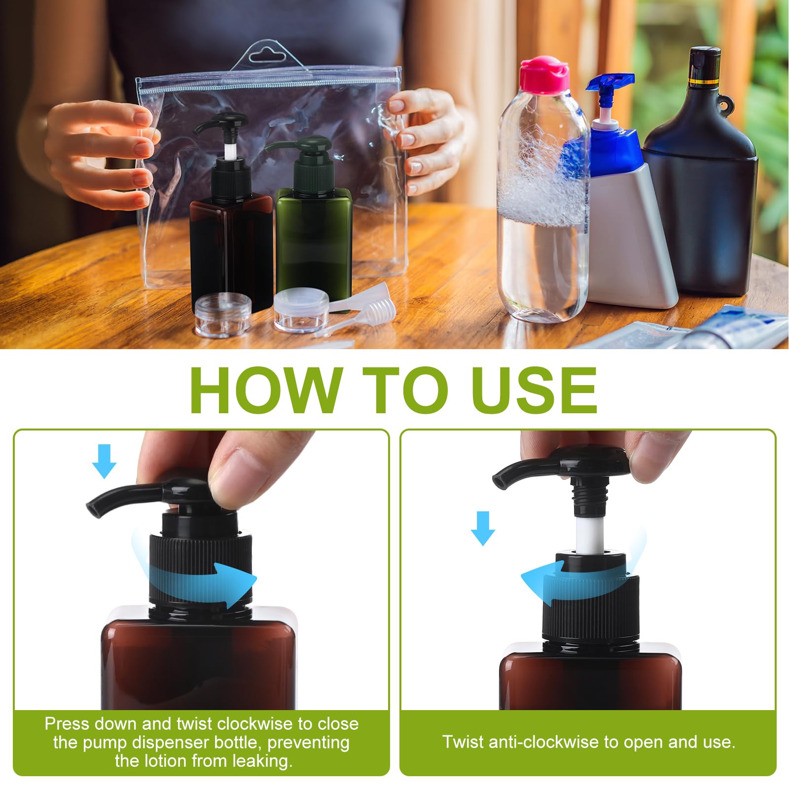 - Leak Proof: the thicker thread design is screwed tighter and effectively prevents leakage; Press down and twist clockwise to close the pump dispenser bottle, preventing the lotion from leaking; Then twist anti clockwise to open and use; No worry of lotion leakage; These plastic sample pump dispensers for shower can be applied to store a variety of liquids, like shampoo, conditioner, shower gel, lotion, body moisturizer, body wash, creams, massage oil, hair oil, hand soap, hand sanitizer etc.