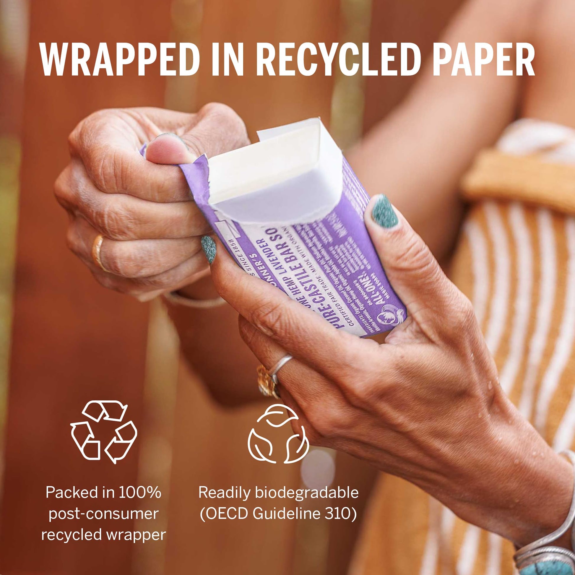 - Packaged in 100% post-consumer recycled wrappers- Dr. Bronner's is diverting discarded paper waste from landfills by using and increasing demand for recycled materials. This prevents landfill buildup and has a positive environmental impact!