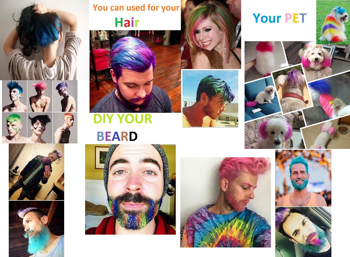 - 【100% NON-TOXIC AND NATURAL】:Non-toxic, Do Not Harm To Your Hair and Skin.Made of natural plants, including deionized water, glycerol and pearl luster, non-toxic materials. You can diy color your hair,your beard or you pet. It's a fun product.