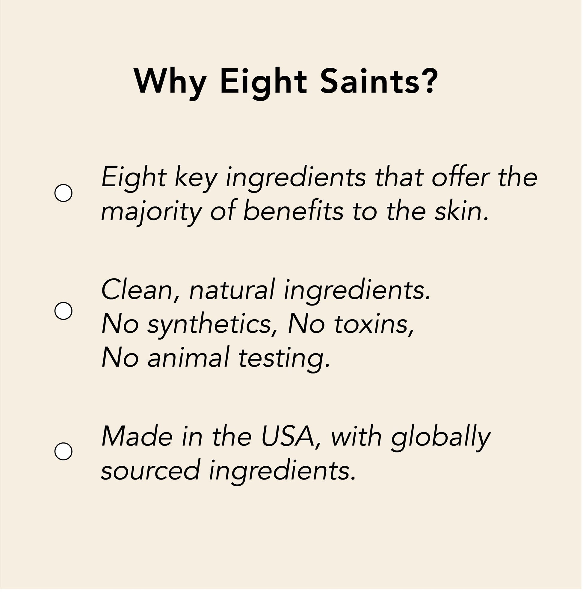 - We're all about providing truth and clarity in natural, effective skincare. In a crowded market with over-hyped “miracle ingredients”, we found most ingredients don't produce results. We drilled down to 8 key ingredients that generated the majority of the benefits for your skin: Our "Eight Saints".