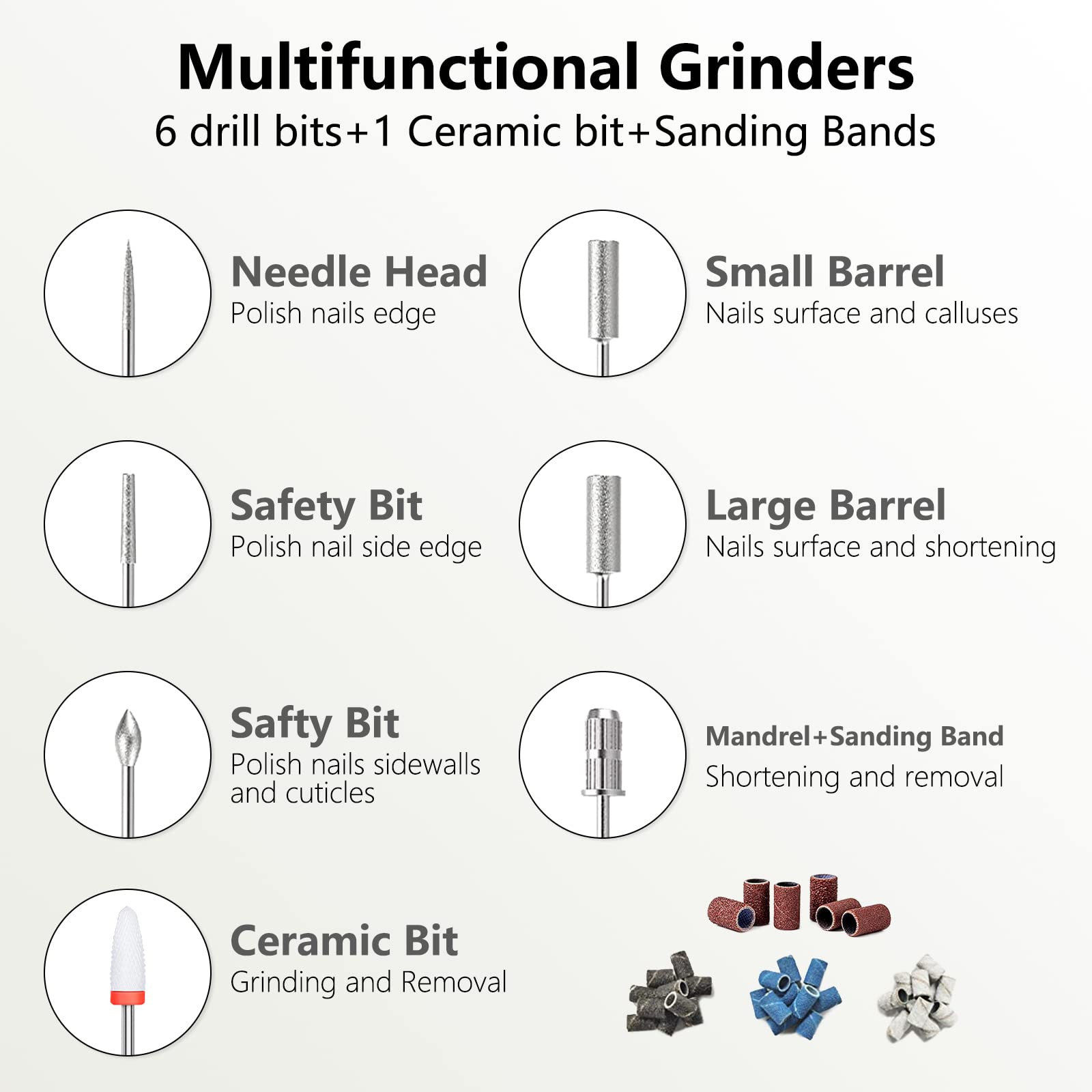 - Professional Electric Nail Drill Set:comes with 6 kinds of metal drill bits and 1ceramic bit,which can meet various manicure and pedicure needs: acrylic nails, gel nails, dip powder nails, cuticle and dead skin, calluses,thick nails.