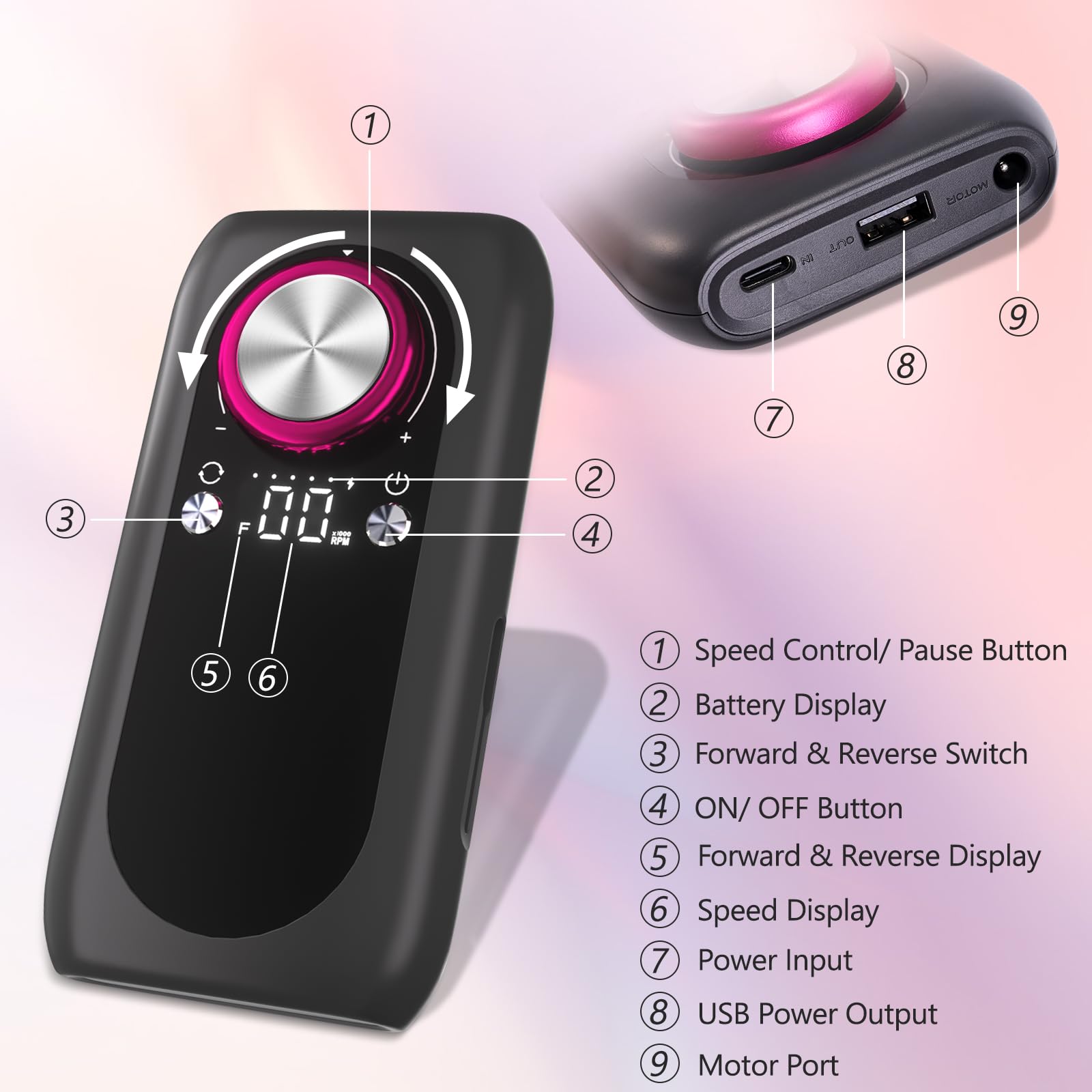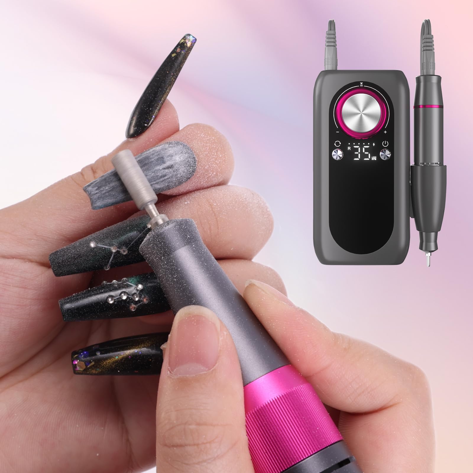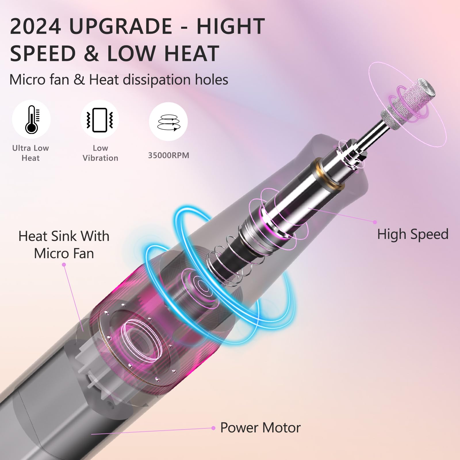 - 2024 Upgrade Electric Nail Drill: The special heat dissipation system with an inner micro fan makes this e filer for nails low heat even a long-time use with a 35000RPM high speed. The pause button(pressing the speed button) with intelligent memory function helps to keep the settings 3mins. Perfect design for professional nail techs, nail lovers, and beginners.