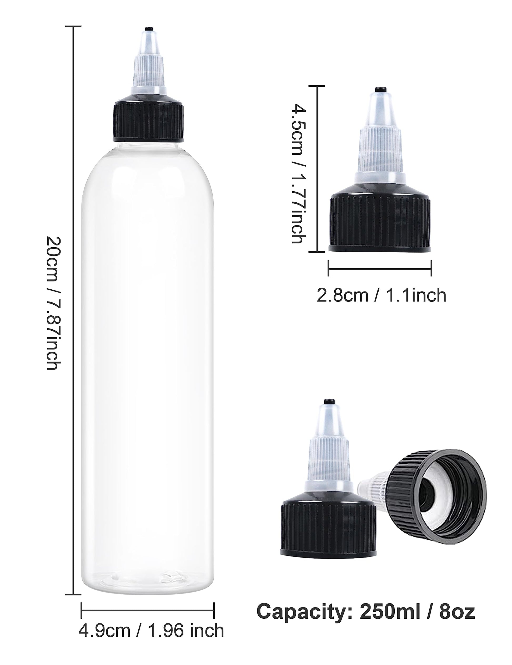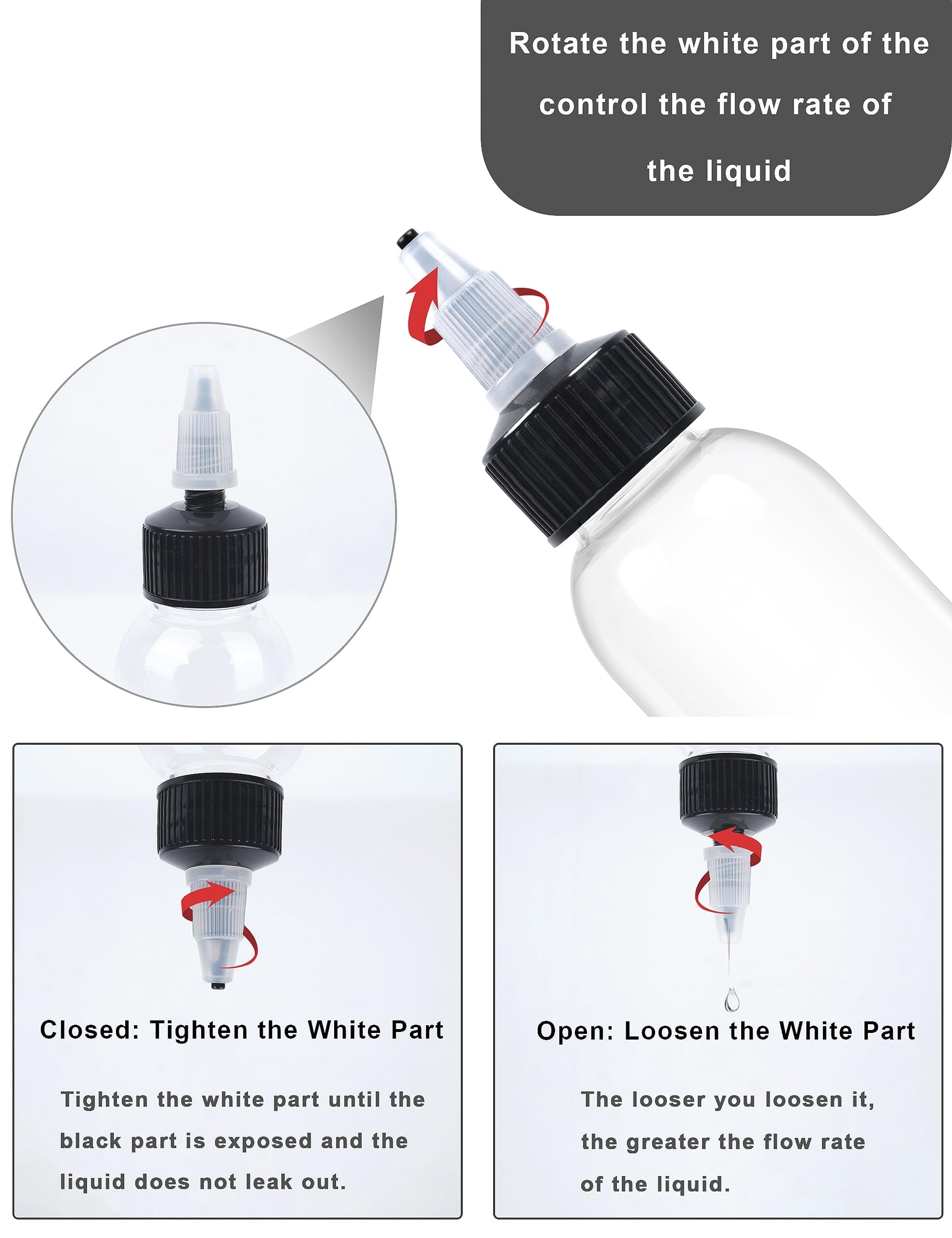 - EASY TO SQUEEZE: You can easily adjust the size of the opening, the more you twist the cap, the larger the opening gets,allowing you to squeeze out more liquid, This gives you precise control over the flow, ensuring safety and cleanliness during use