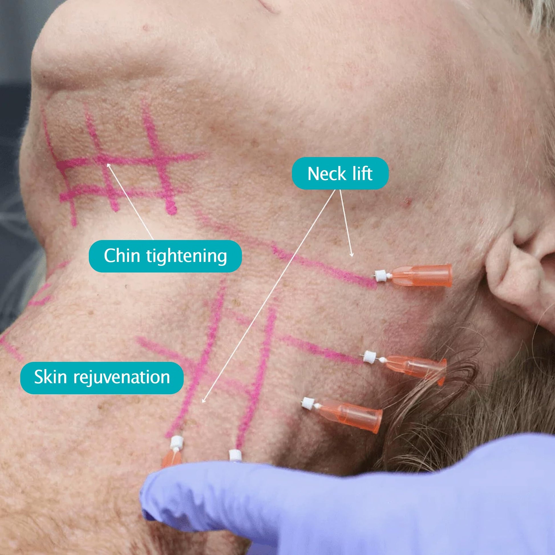 - Mono Thread Contrast Screw Thread: This creates more collagen and elastin compared to mono threads, for facelifts, brows, upper lip, cheeks marionette lines(either side of mouth), jowls and jaw, neck whole body.