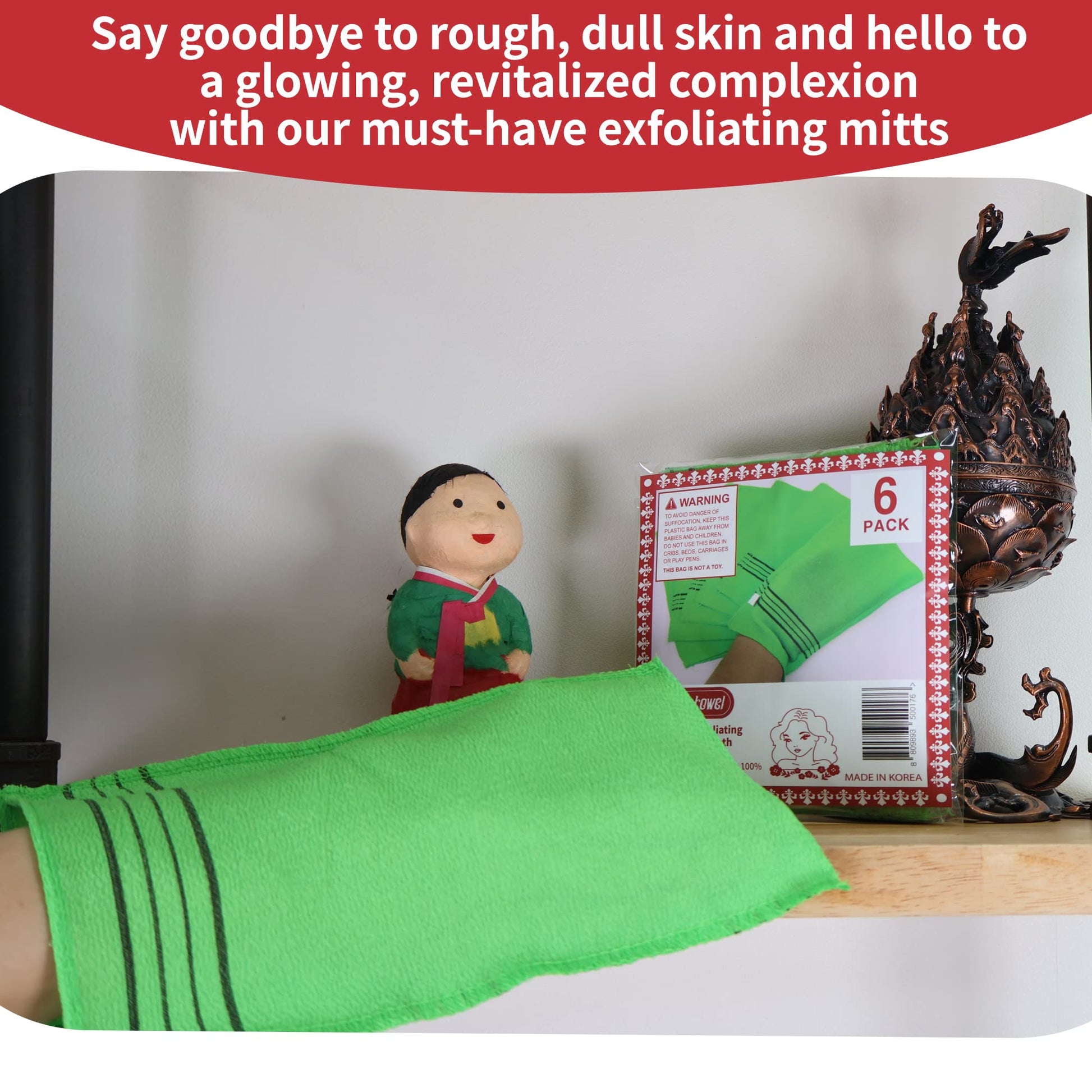 etreetowel Extra Large Size 9.9" x 5.5" (6 PCs) Korean Asian Exfoliating Bath Washcloths Mitt Scrub for Body washcloth Glove Viscose Rayon Towel for Soft Skin Korea Made