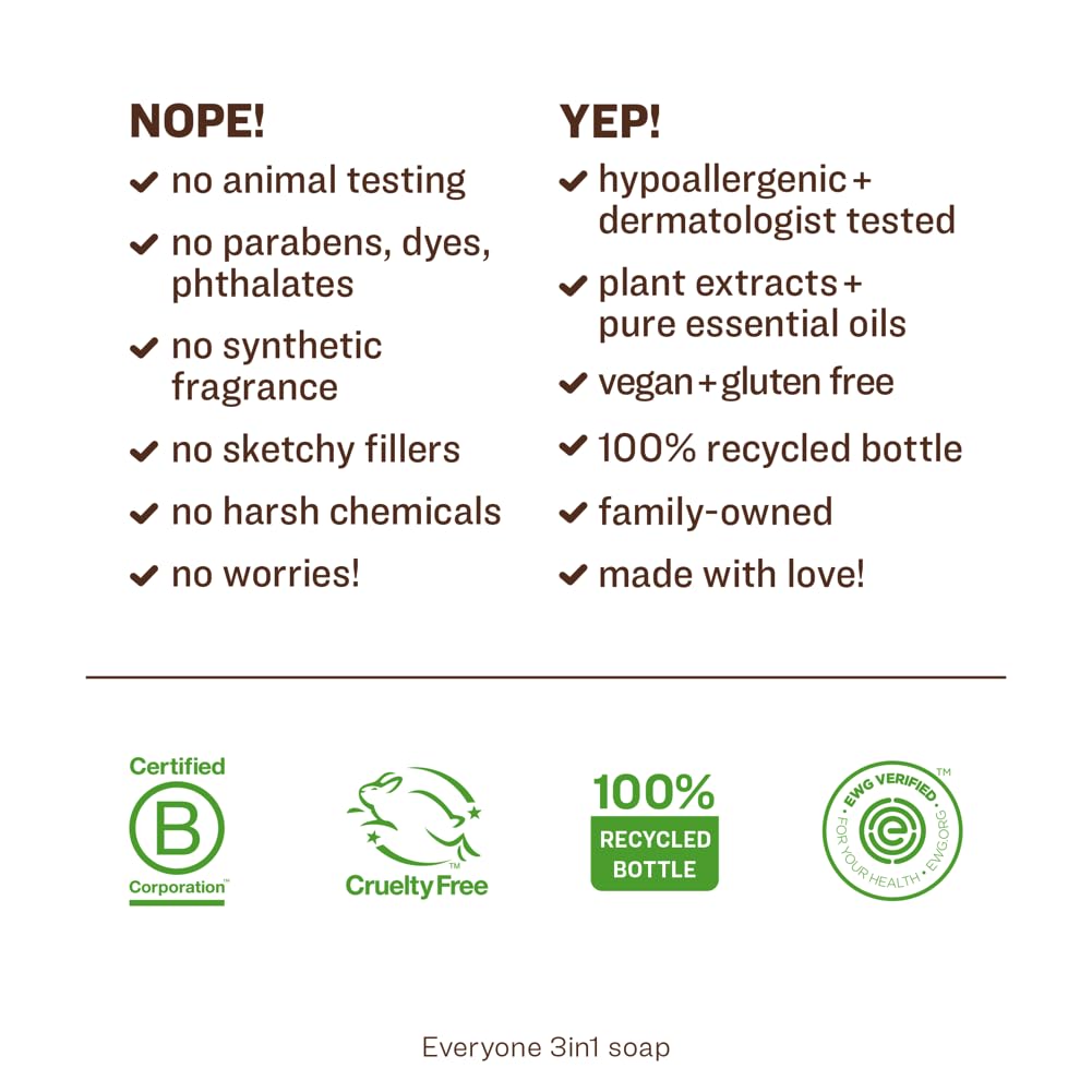 - Clean Promise: Everyone 3in1 Soap is EWG verified, GMO free, cruelty free, gluten free, triclosan free, and synthetic fragrance free