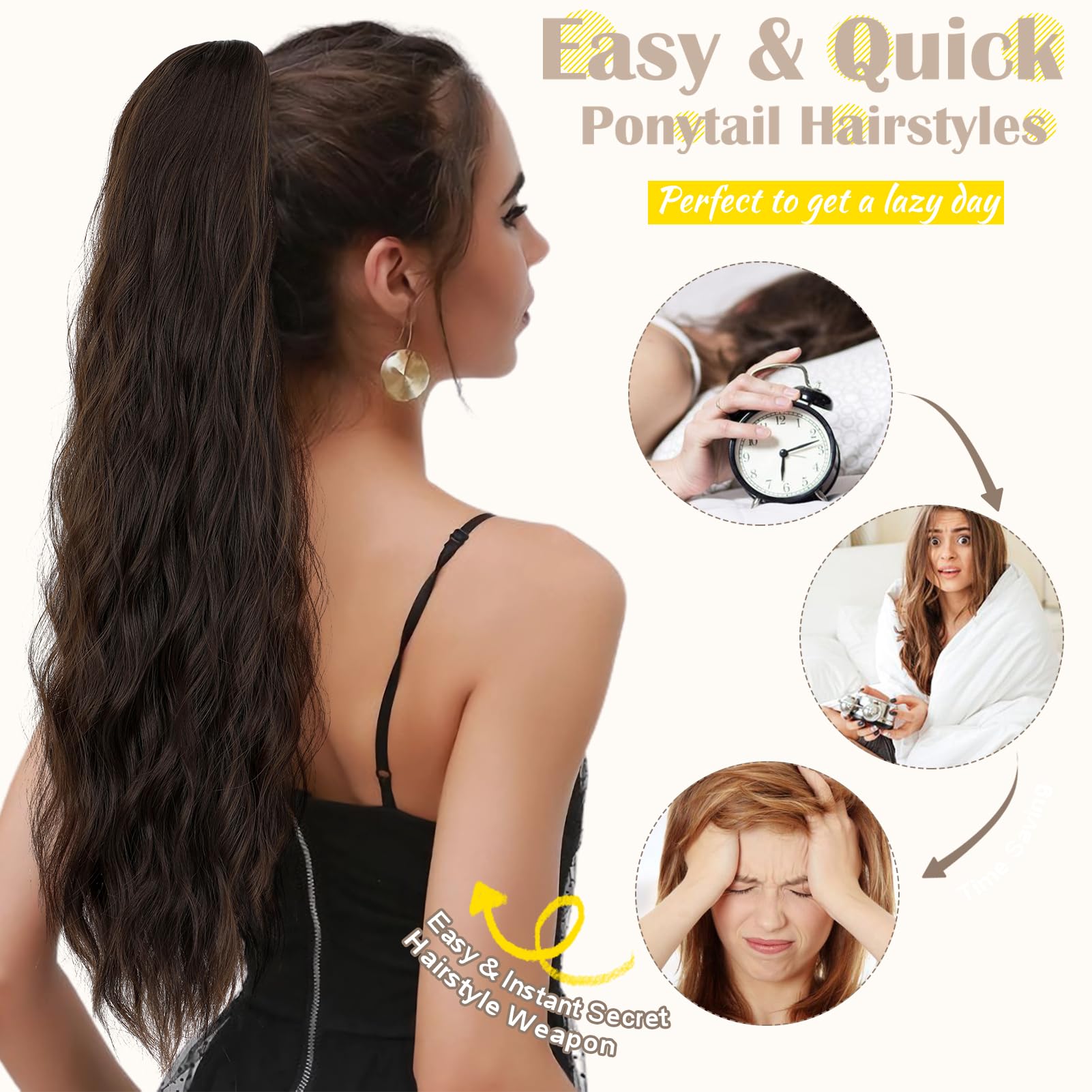 - Instantly change your hair style:Simply put your own hair in a bun and insert the clips of the hair extension ponytail and pull the elastic cord to secure it. The ponytail is perfect for beginners. It takes less than 1 minute to instantly add volume and length to your hair and create a stunning long curly wavy ponytail extension new look without damaging your hair, saving you time and money