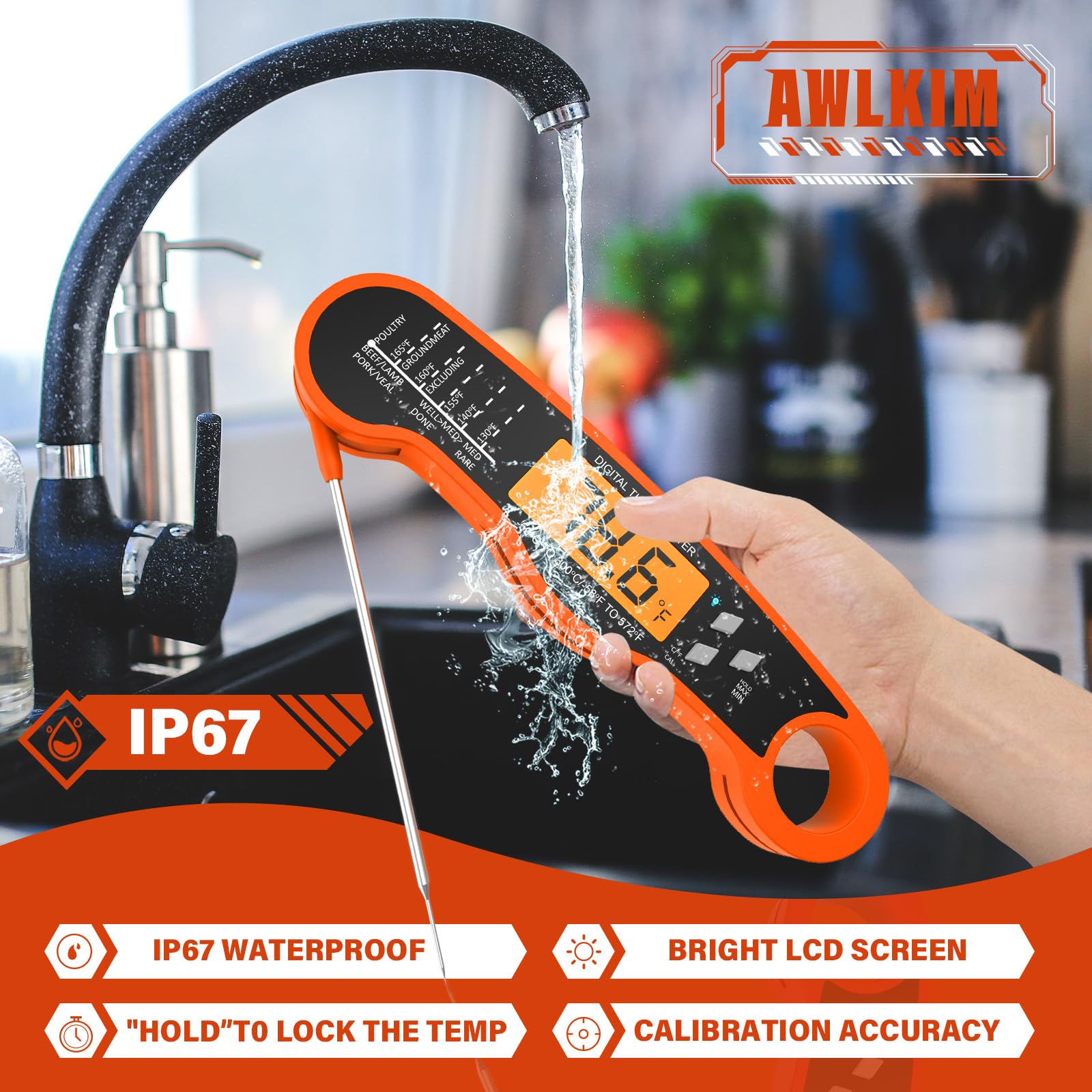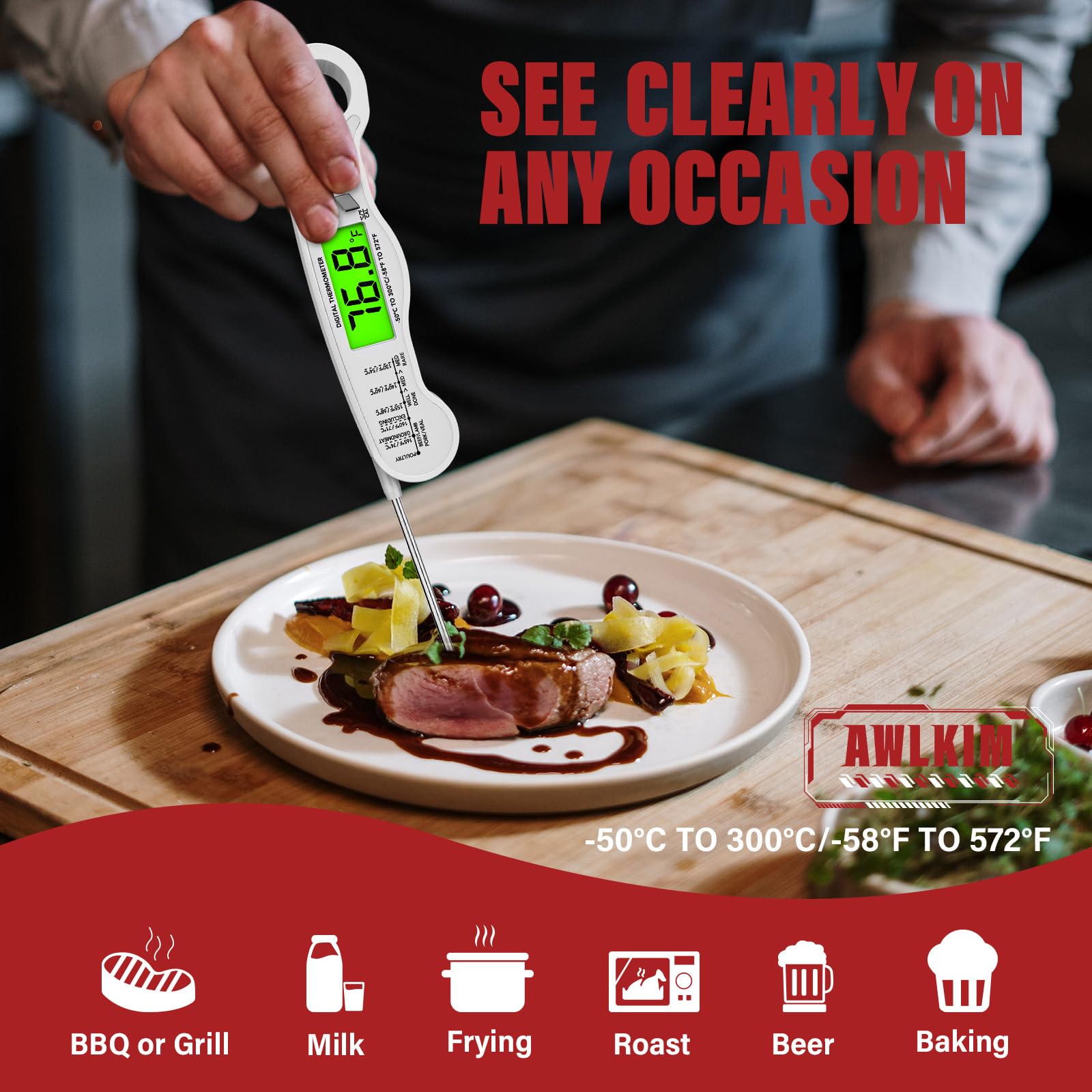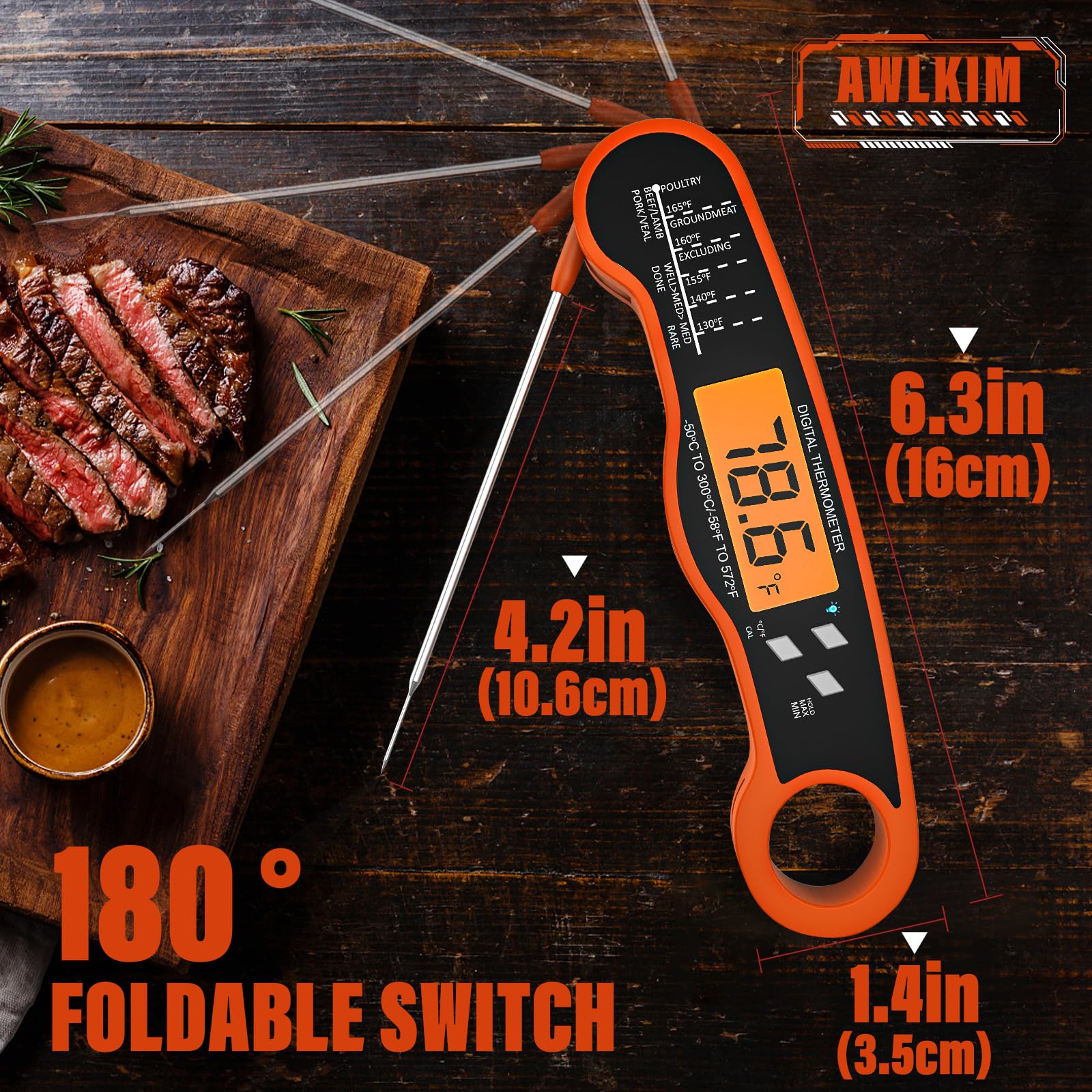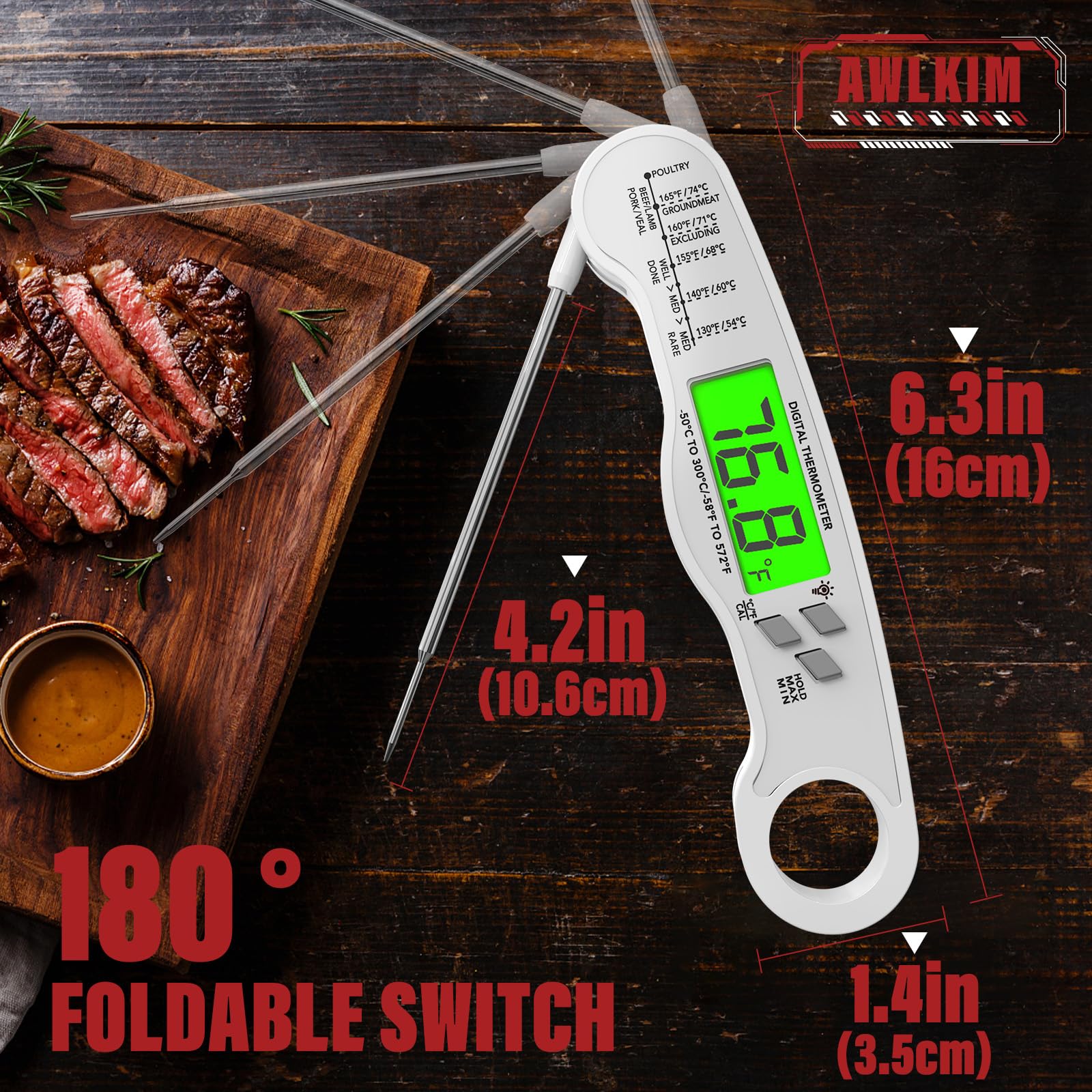 - Effortless, Any-Time Readability - Designed for ultimate convenience. The large, backlit LCD screen automatically illuminates when unfolded, providing crystal-clear visibility in any lighting—from a dimly lit kitchen to an evening grill session. Its intuitive, fold-to-open design makes temperature checks truly hassle-free