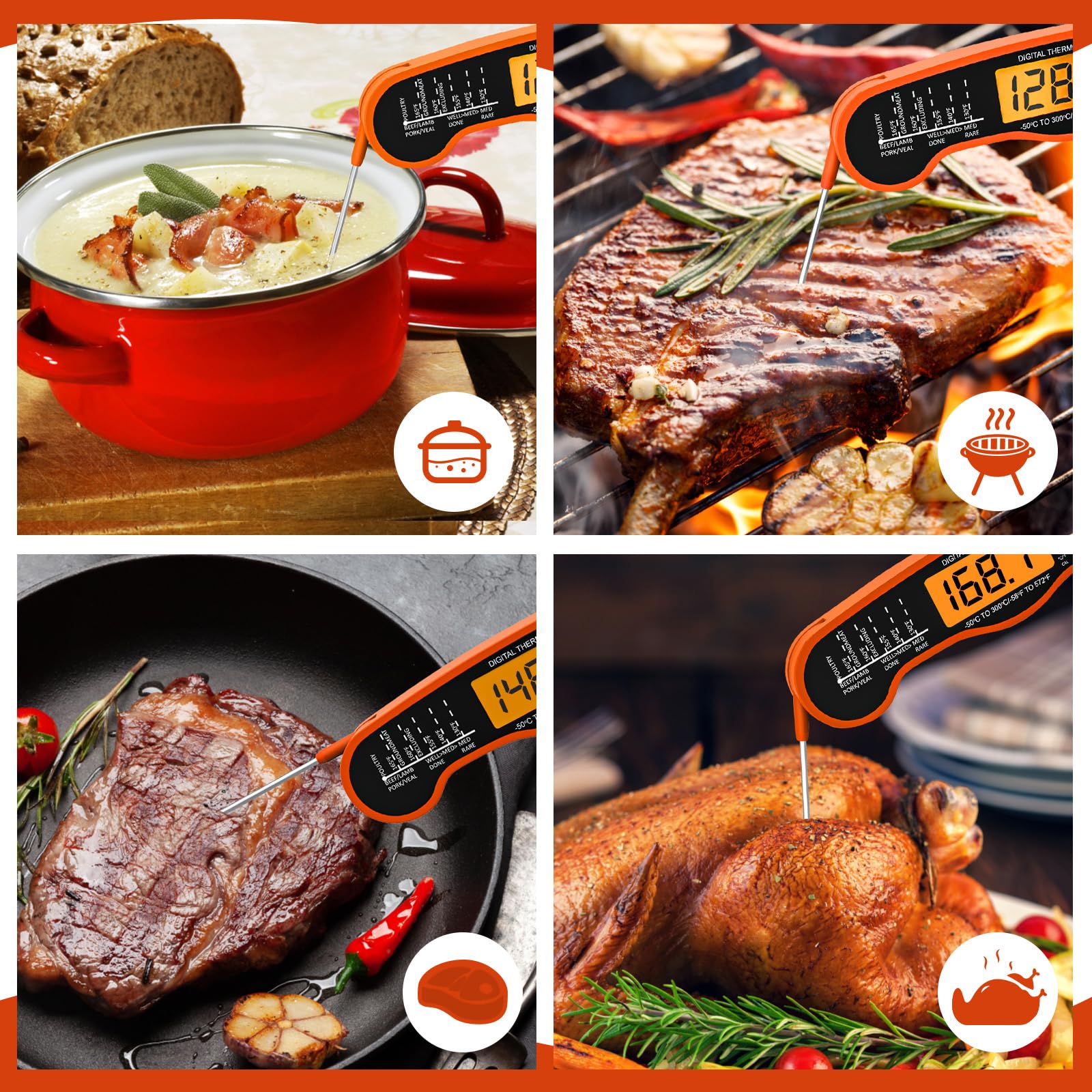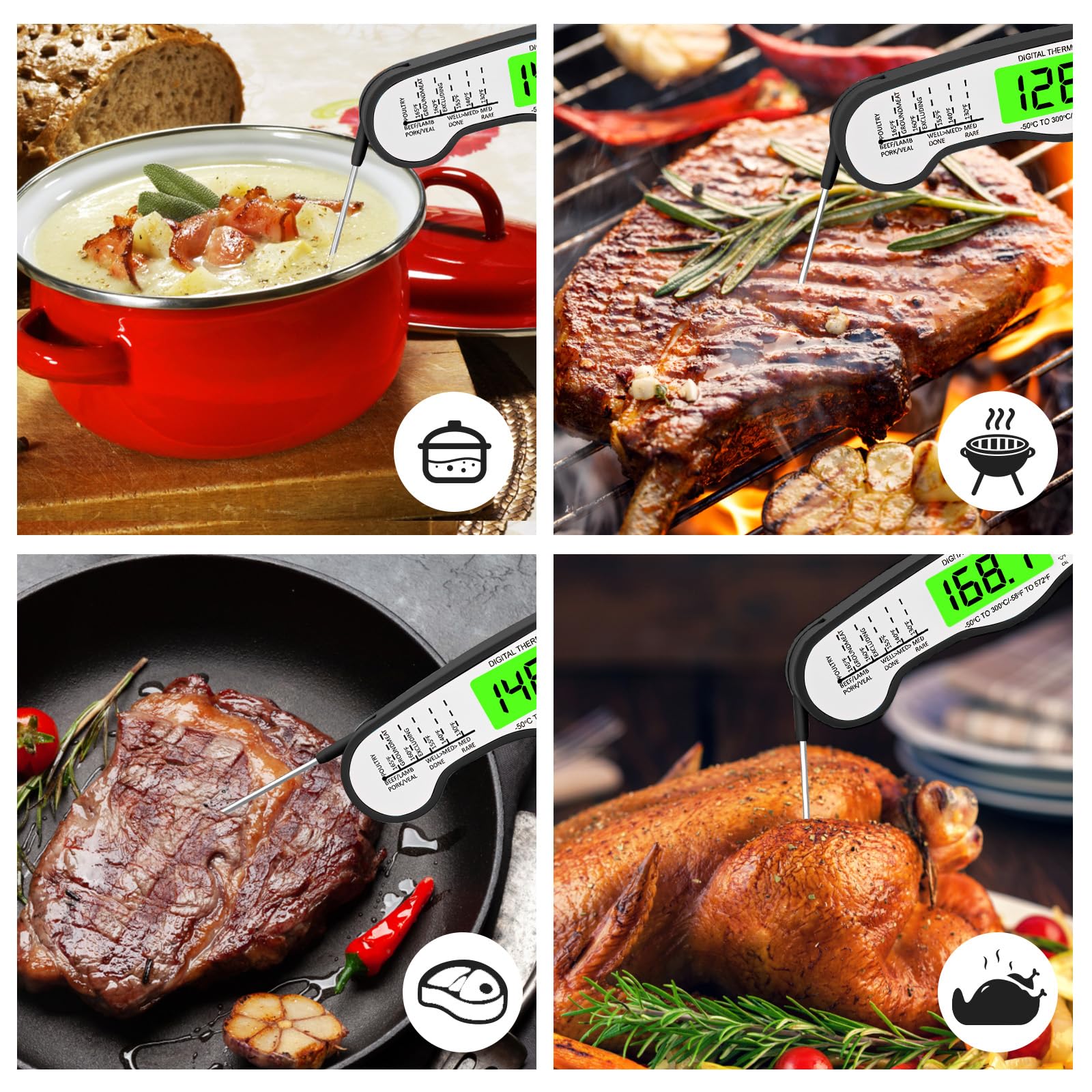 - Lightning-Fast Precision - Experience unmatched speed and accuracy with our digital meat thermometer. Its ultra-fine 1.7mm probe delivers precise temperature readings within 2-3 seconds, ensuring your meats are perfectly cooked—juicy, safe, and never overdone. The ultimate tool for both professional chefs and home cooking enthusiasts