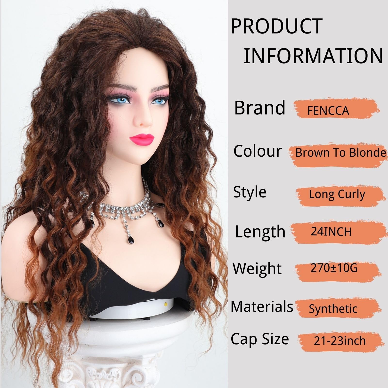 Fencca Brown Ombre Blonde Long Curly Wigs for Women Heat Synthetic Free Part Wave Curly Wig Strawberry Blonde Loose Curly Wigs for Daily Party