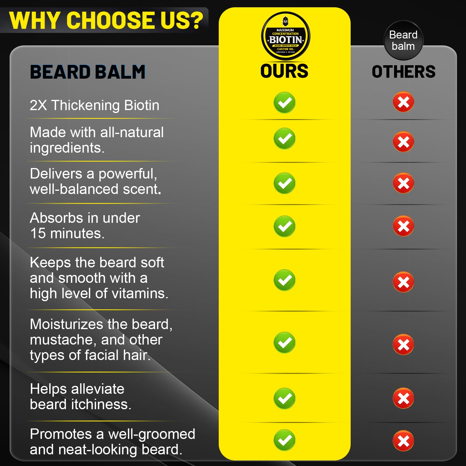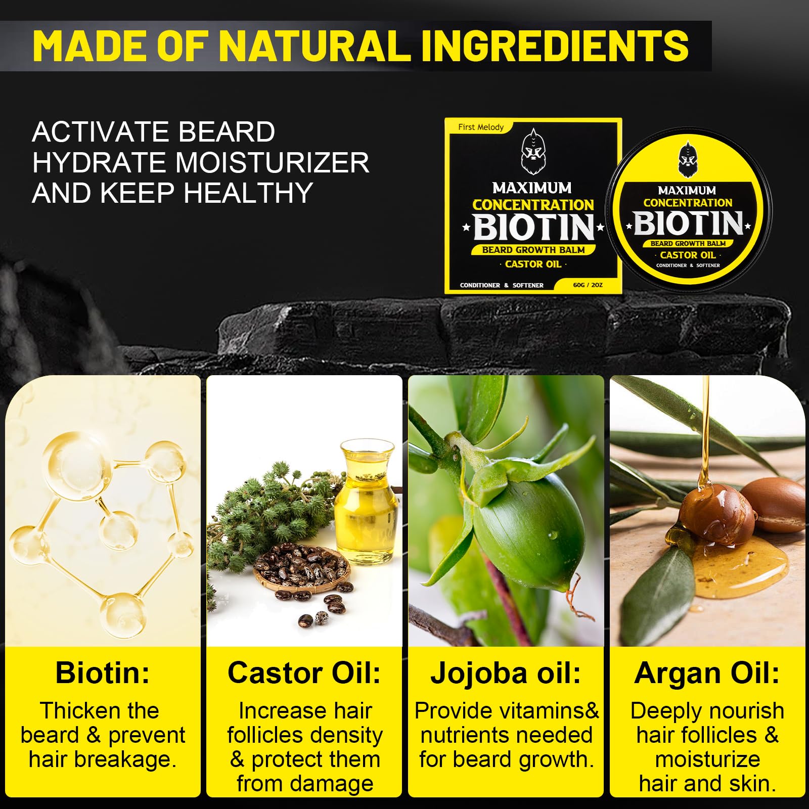 - 【MAXIMUM CONCENTRATION BIOTIN BEARD BALM】 Our beard balm is specifically formulated to promote beard growth and soften your beard. Biotin, one of the key ingredients, helps strengthen hair follicles, promoting healthy beard growth. As a topical application, biotin nourishes your hair follicles and prevents shedding while revitalizing and improving the appearance of your weak and damaged hair
