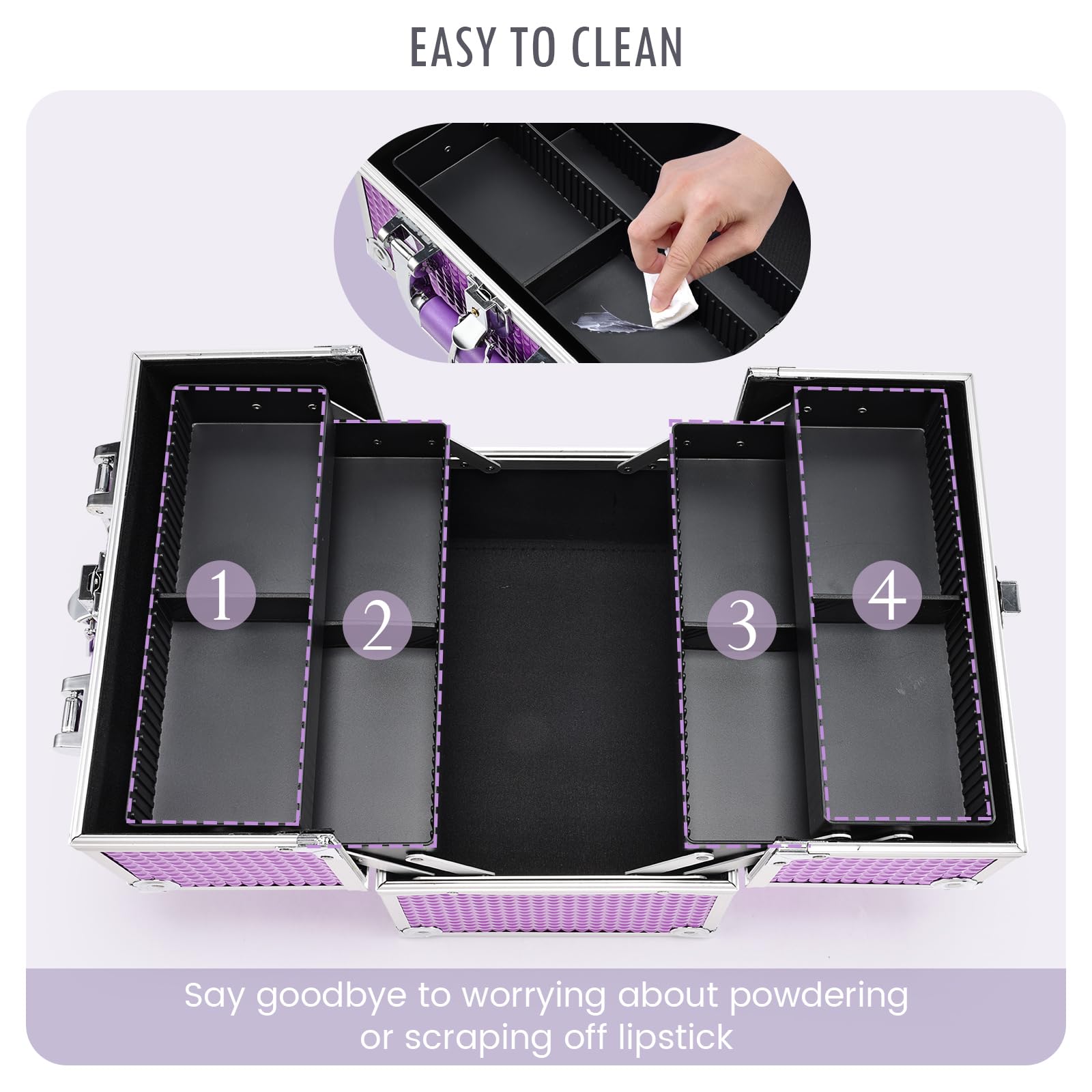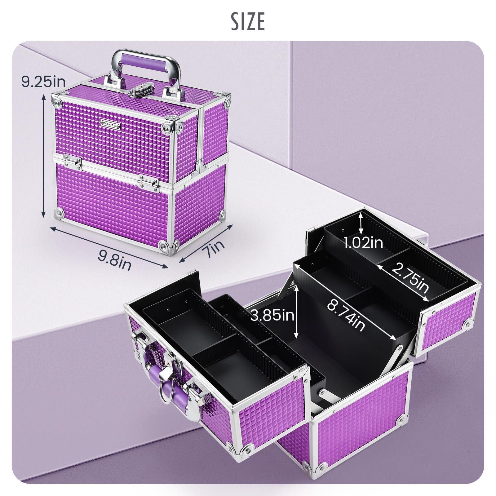 Frenessa Makeup Train Case Cosmetic Box Organizer Storage Portable 4 Trays Jewelry Storage Organizer with Lockable Dividers for Makeup Artist, Crafter, Makeup Tools Traveling Makeup Case Purple
