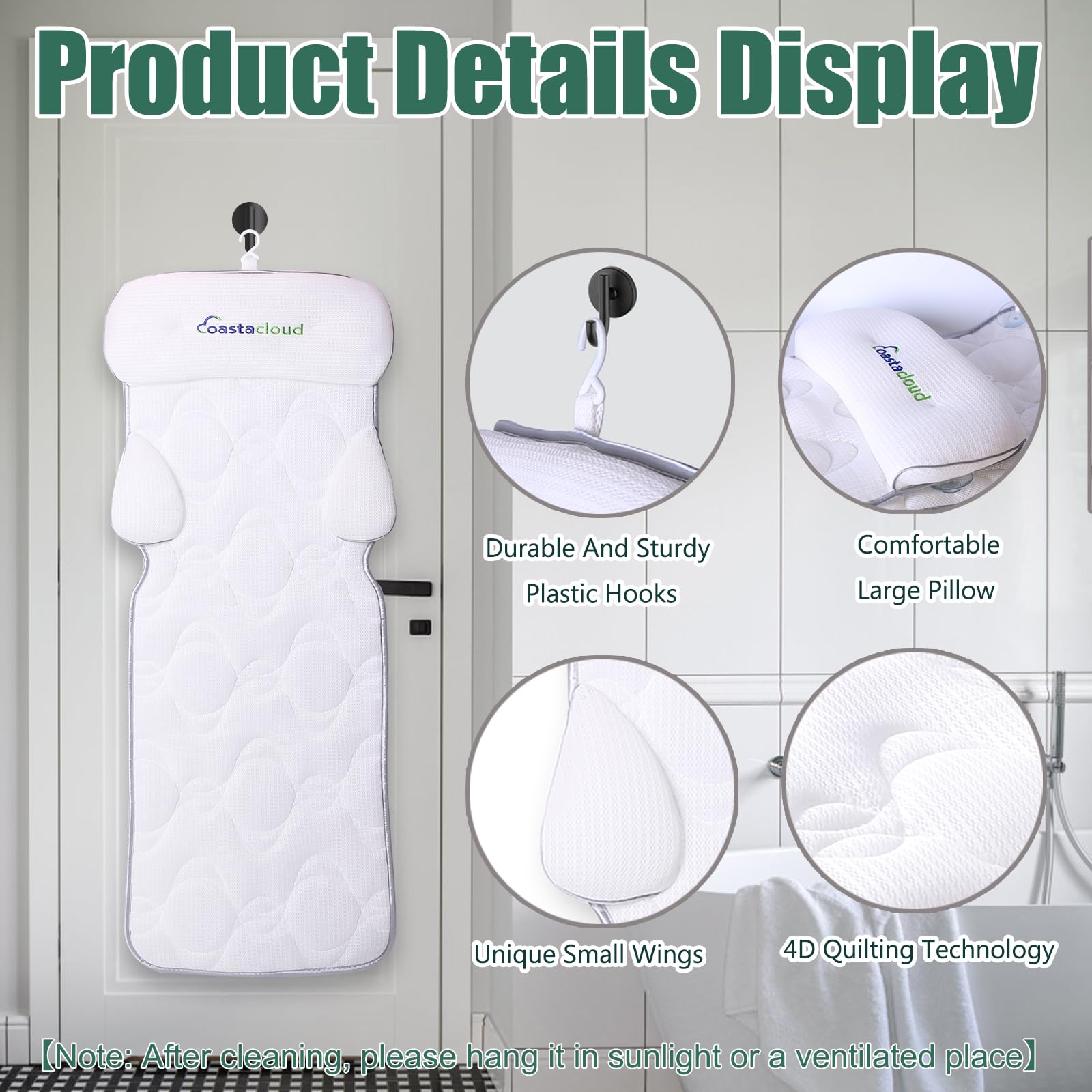 - FULL BODY BATHTUB MAT & PILLOW - A bath pillow for your entire body, it takes the pressure off of your back, neck and tailbone while offering an extra thick head rest and two small wings. Enjoy the really relaxation after working or sporting.