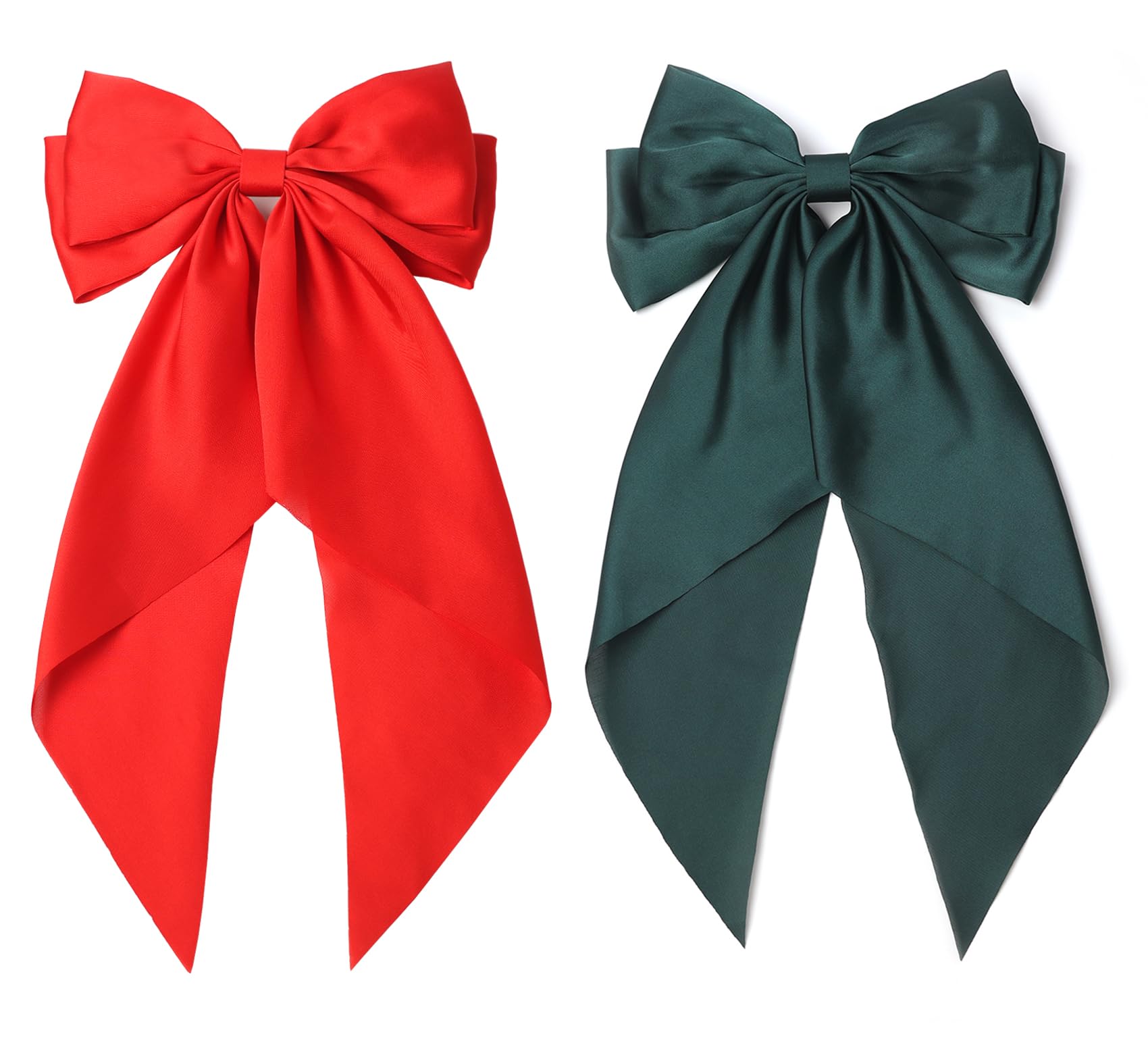 Furling Pompoms Hair Bows for Women,Large Satin Silky Hair Bow Clips Ribbon Long Tail French Barrette Hair Clamps Girls Hair Accessories Party Wedding Charm Green Red Hair Bows