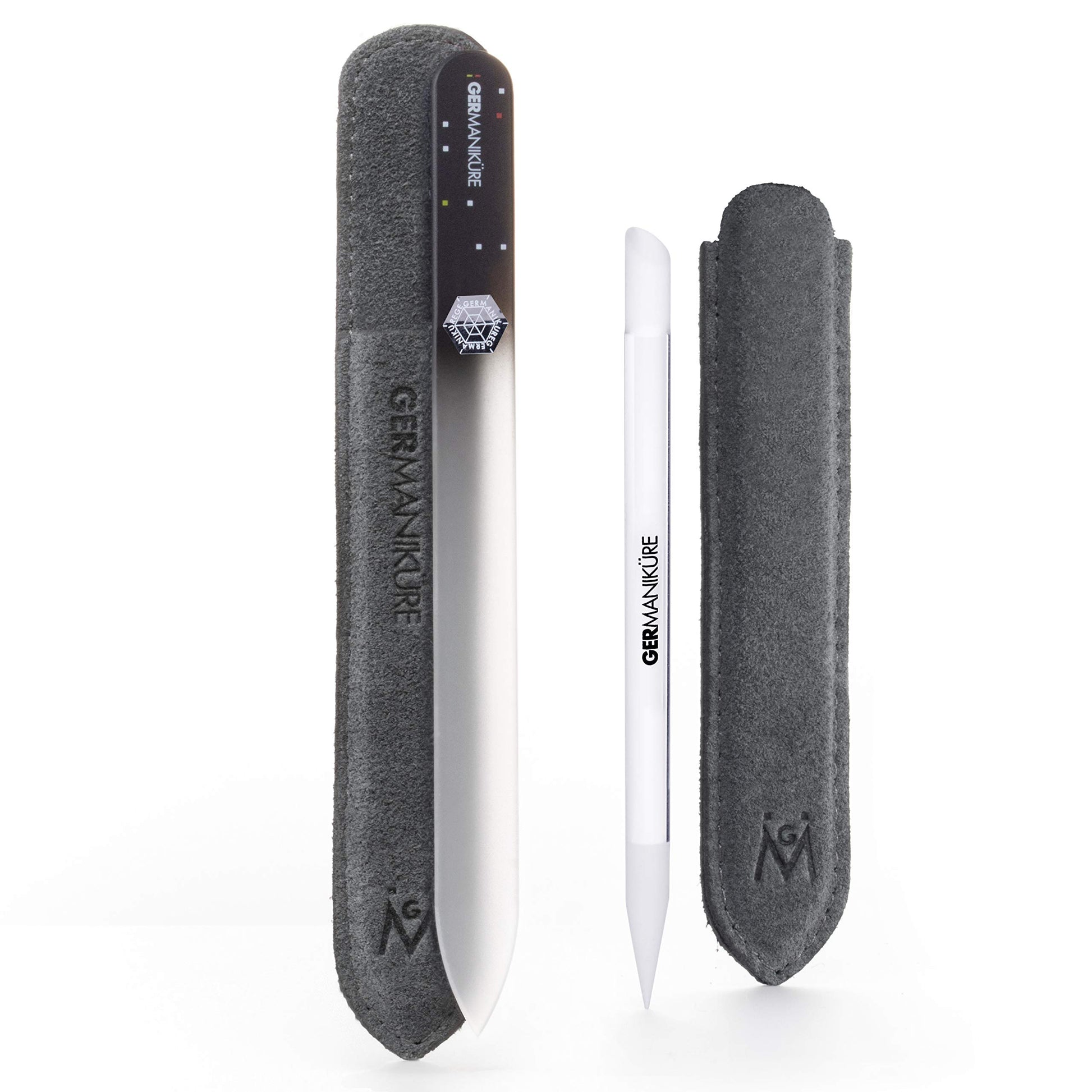 GERMANIKURE Crystal Glass Cuticle Stick & Black Nail File Set in Suede Leather Case – Handmade in Czech Republic – Professional Manicure Supplies – Cuticle Pusher, Callous Remover