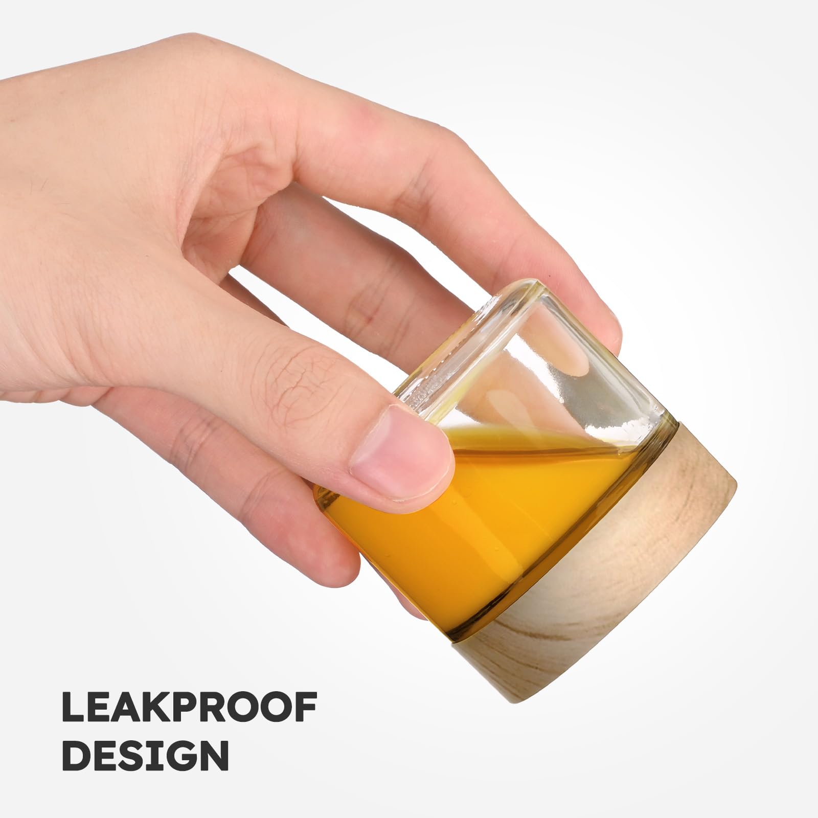 - High-Quality: These mini jars with lids are made of strong thick glass, plastic woodgrain lids with soft plastic cones on the inside to ensure no leakage. The conical inner cap tightly adheres to the bottle mouth to ensure an airtight seal.