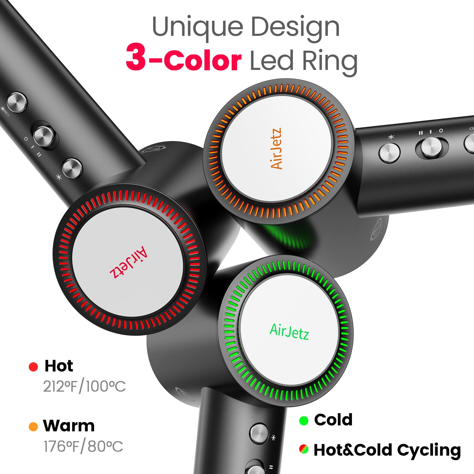 - Thermo Control & Low Noise: The AirJetz blow dryer with diffuser is equipped with an advanced thermal control system that measures the airflow temperature more than 60 times/s, ensuring it even & precise, no more overheating damage to your hair. Additionally, the professional hair dryer for women adopts professional air duct design and excellent sound insulation technology, with a noise value of only 76db, so you won't disturb others when you use it.