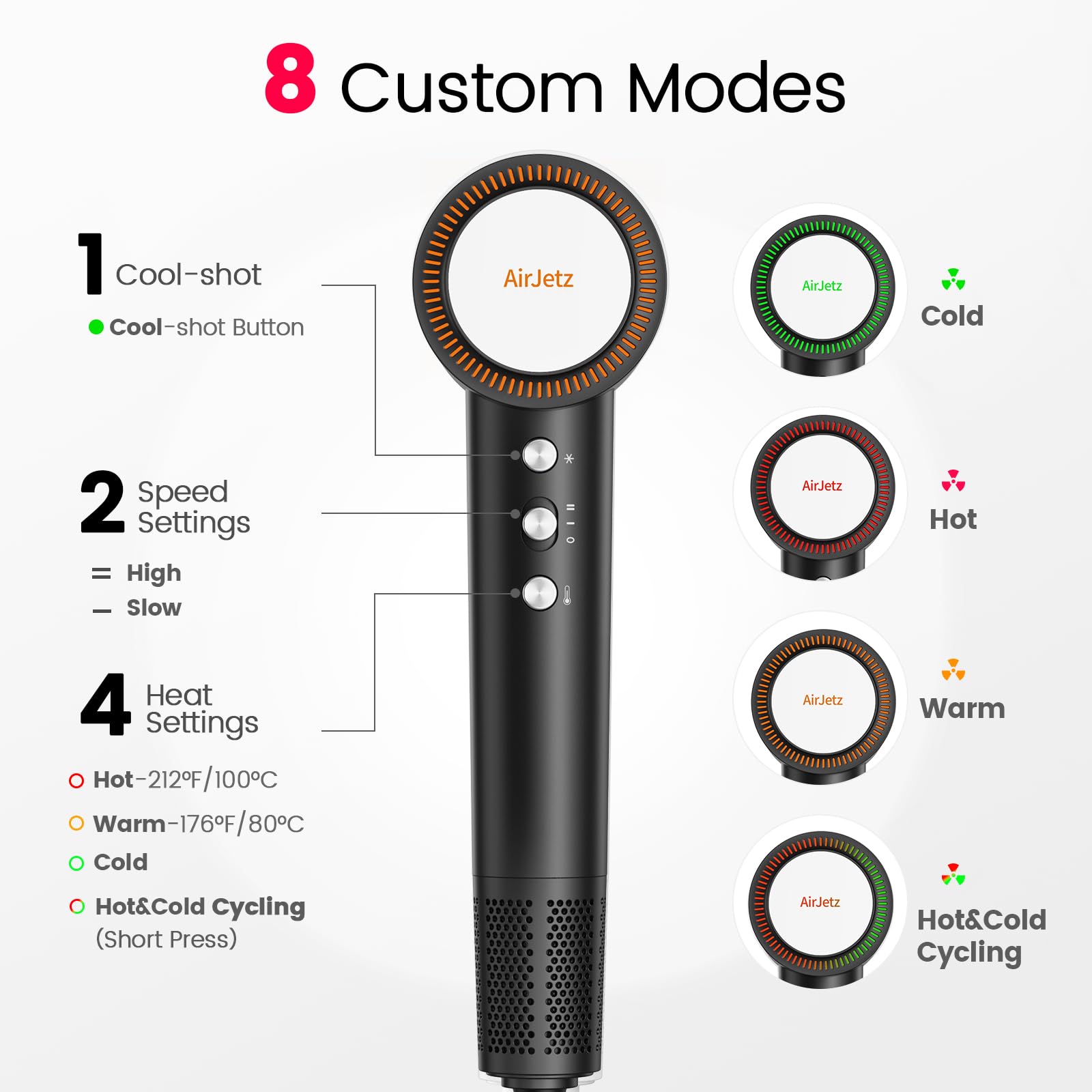 - 8 Drying Modes & Cool-shot Button: The hairdryer offers 4 heat settings (cold/warm(176℉/80℃)/hot(212℉/100℃)/hot & cold cycle mode), 2 speed settings (gentle/fast), and a cool-shot button. It also features an LED display with three different colors: Red for hot air, orange for warm air, green for cold air, and a green & red alternating gradient for the hot & cold cycle, allowing you to find the perfect setting for your hair type and desired style, ideal for all hair types.