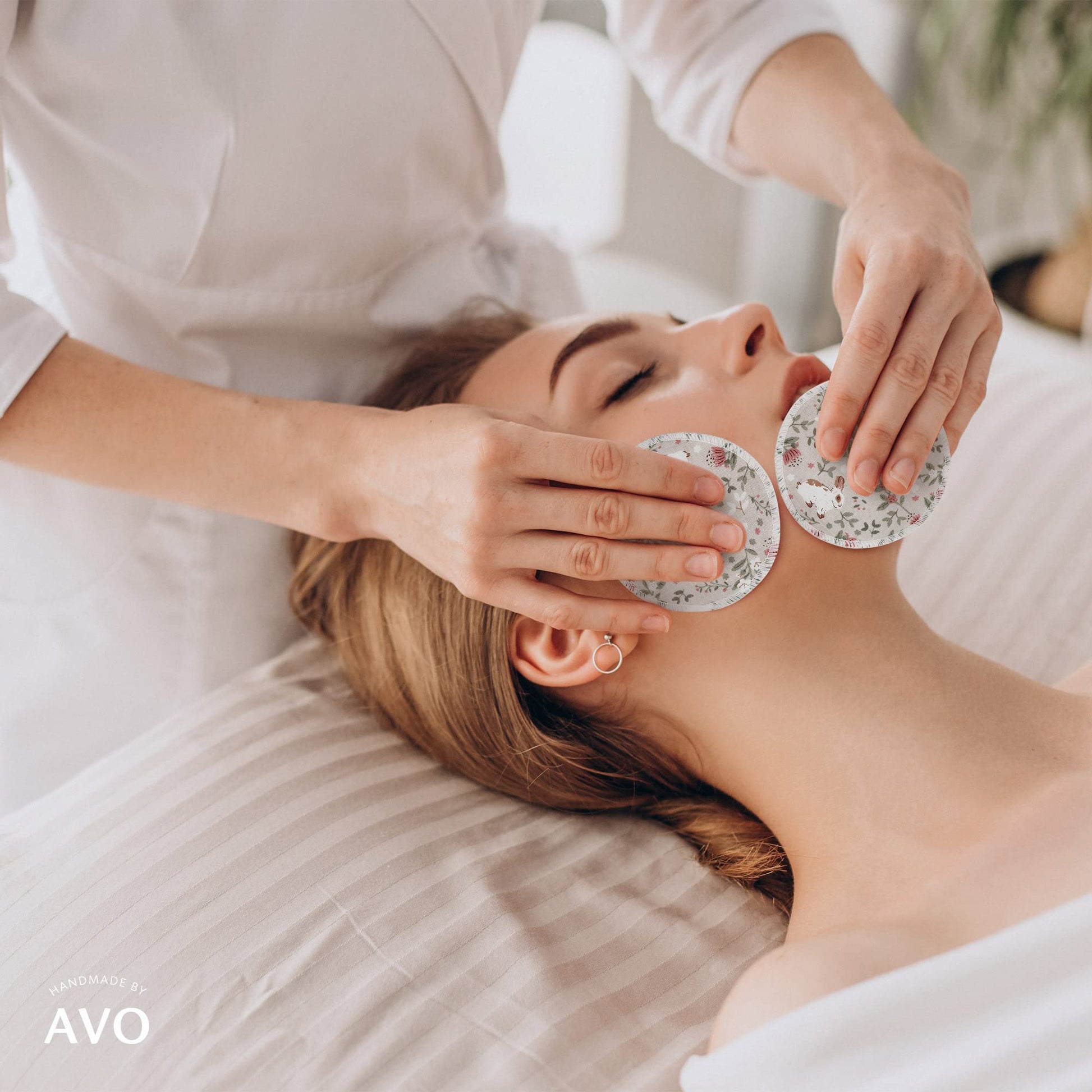 Handmade by AVO - 8 Reusable Pads, Makeup Remover, Quilted Organic Cotton Rounds, Pads Facial Rounds Fabric Pouch Laundry Bag (Rabbit)