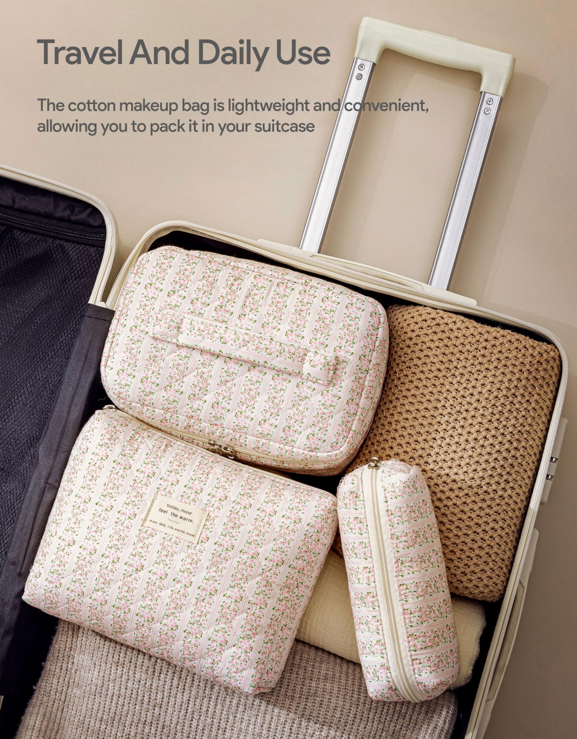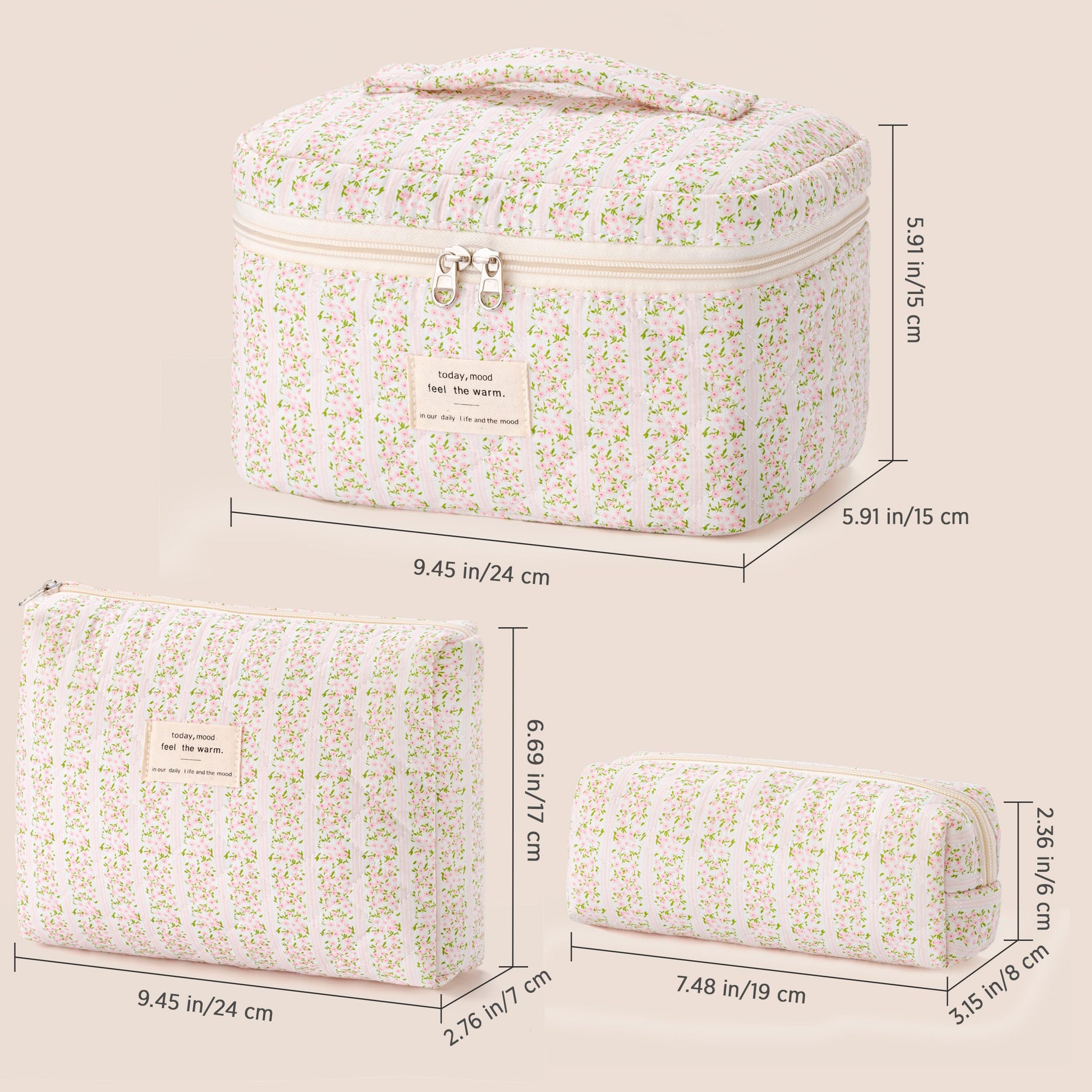 HBselect Quilted Makeup Bag, 3PCS Cotton Large Travel Makeup Bag, Cute Floral Coquette Make up Bag Cosmetic Bag Toiletry Bag for Women Girls