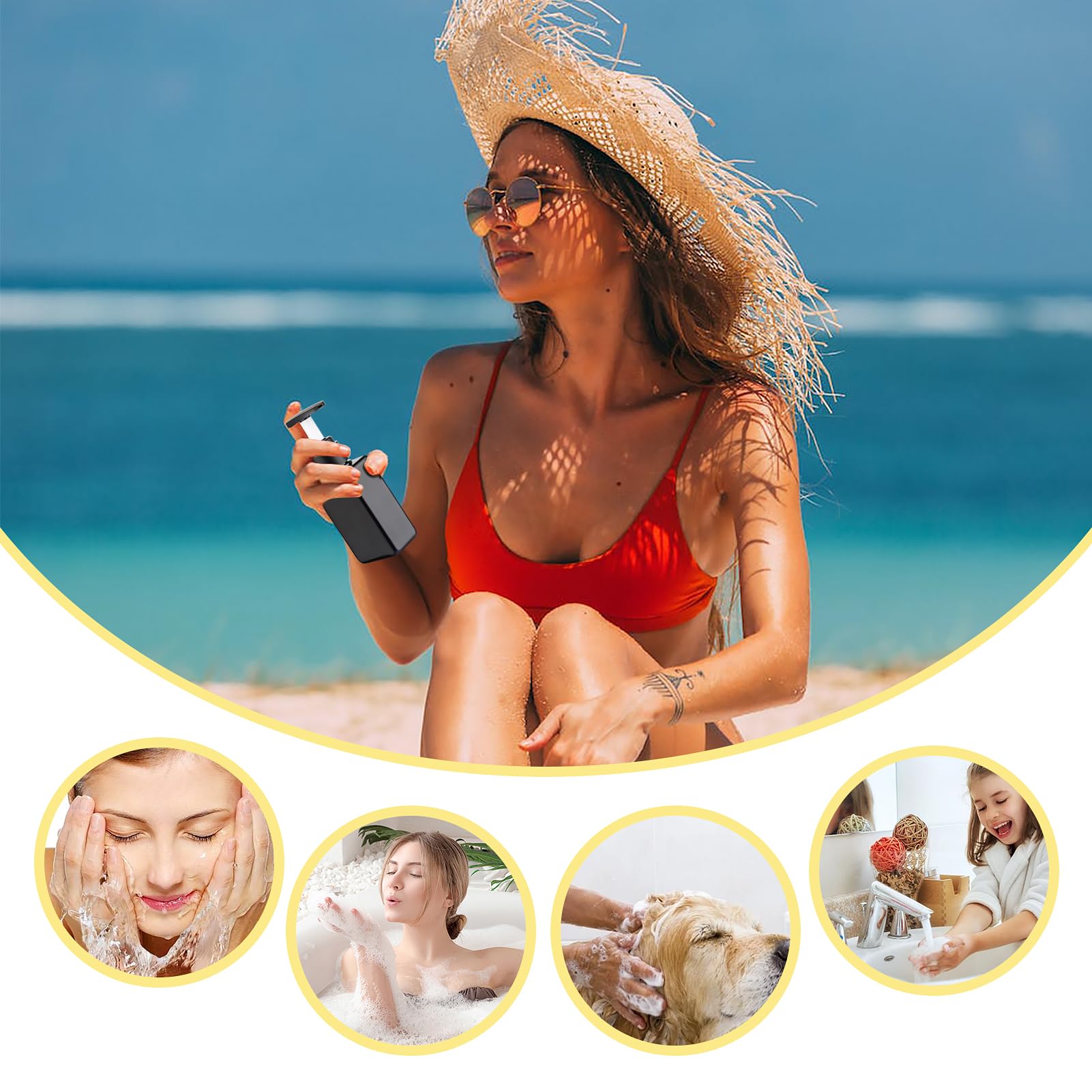 - 【PORTABLE & LEAK-PROOF】When you package travel size bottles to the travel, beach, or swimming pool, press down and twist clockwise to close, preventing the lotion from leaking. Twist anti-clockwise to open and use.