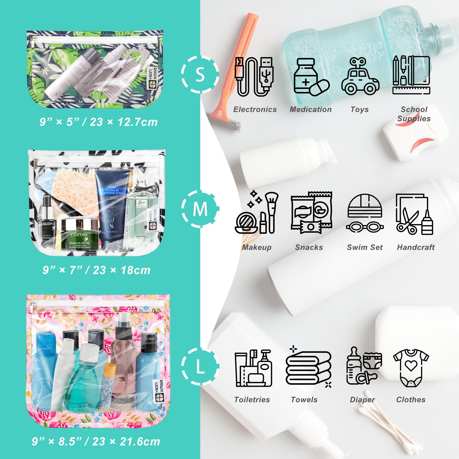 - TSA APPROVED: Always stuck in check point and waste more time?Get our tsa approved toiletry bag and experience a smoother screening process,travel with ease.TSA compliant for our travel toiletry bag to avoid repacking in awkward situations.Save your time and no more hold-ups or hassles at each point like airport,stadium,park,etc.You can quickly pass through the security screening and easily get items anytime.The set includes Large: 9" x 8.5" Medium: 9" x 7" Small: 9" x 5".Good to go anytime!