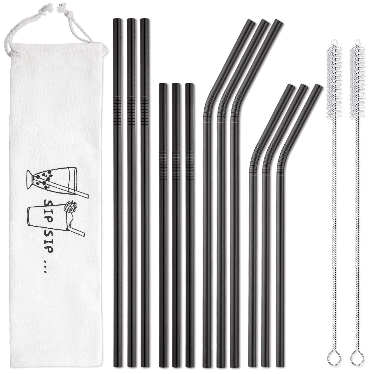 Hiware 12-Pack Black Stainless Steel Straws Reusable with Case - Metal Drinking Straws for 30oz and 20oz Tumblers Dishwasher Safe, 2 Cleaning Brushes Included