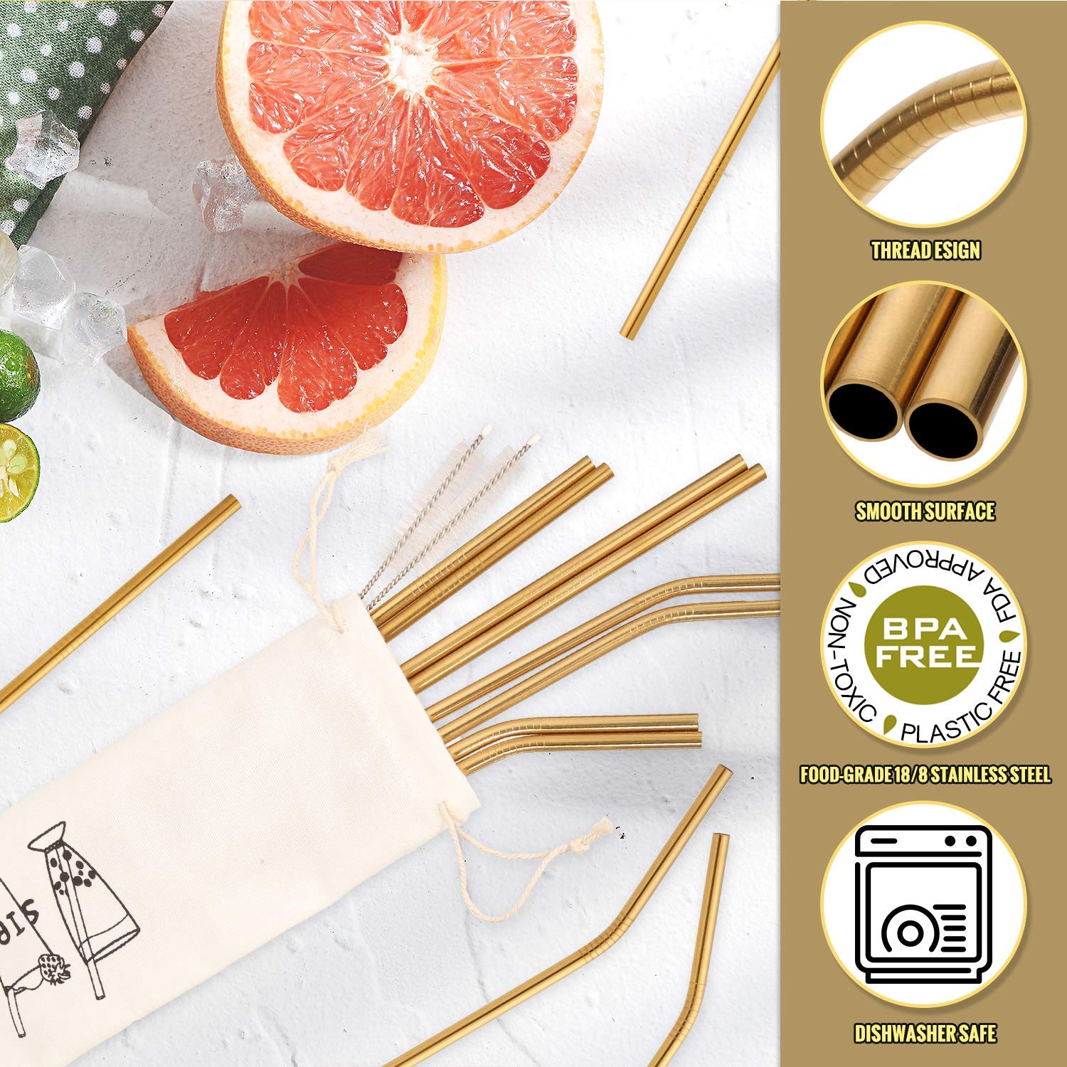 - 18/8 FOOD GRADE STAINLESS STEEL - BPA and lead free, Dishwasher Safe, No metal aftertaste, Colorfast, Plastic free, Reusable and Environmentally Friendly. As a safe and suitable alternative to plastic, they are safer for the environment. Not only the straw is environmental, the portable bag is the same. The material of the bag is natural cotton, It can be decomposed in the natural environment. Beside this, these straws are easy to carry by your handbag.