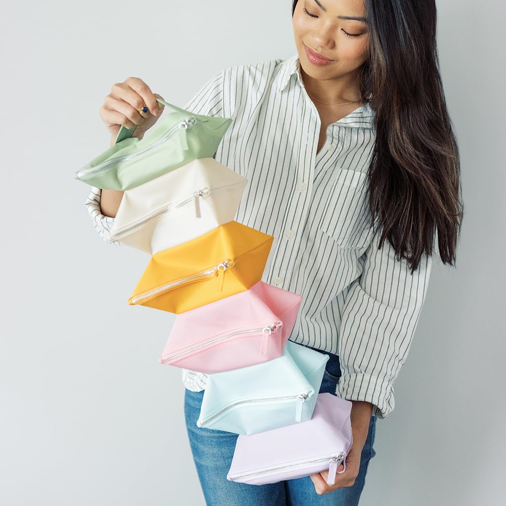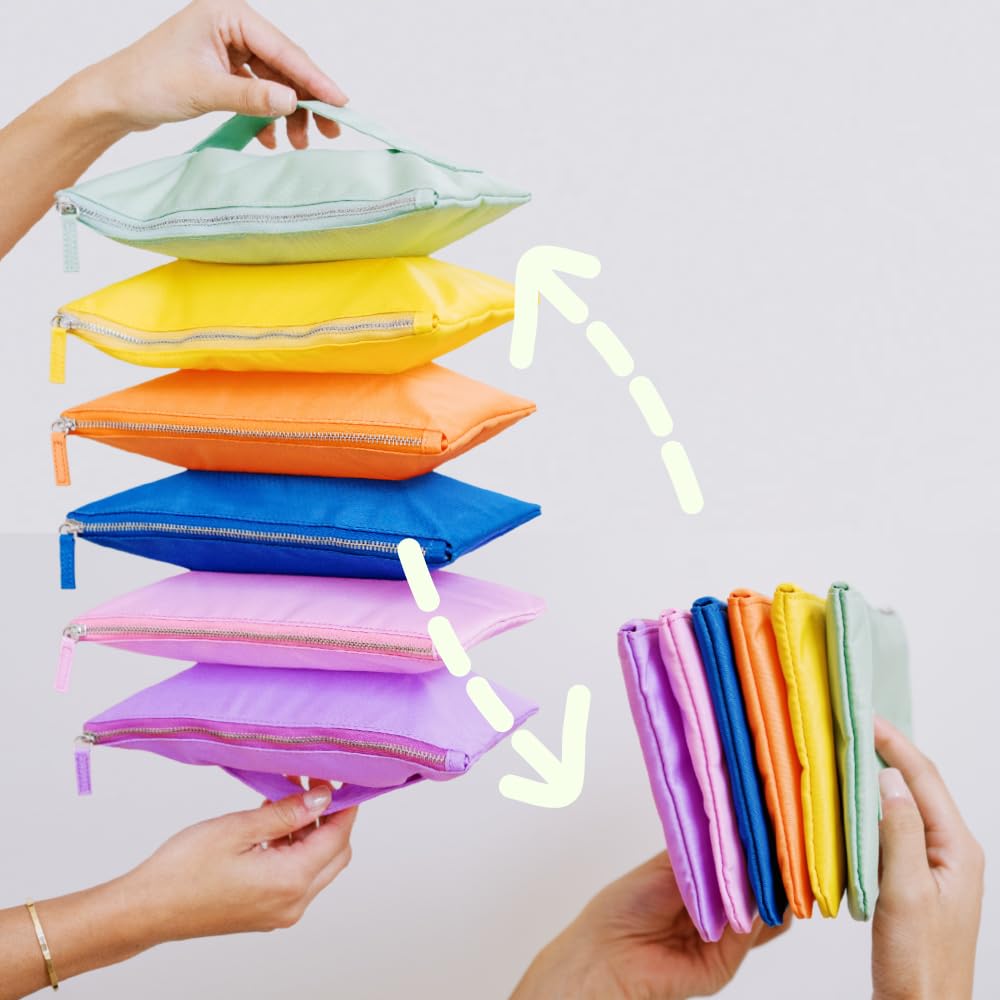 Our new color-way in our very popular accordion bag: Dusk til Dawn! Muted down horizon palette, but still dopamine inducing. Nesting? In your organization-era? Tired of carrying around an ordinary pouch? Ditch that sad, disorganized, over-stuffed pouch and liven up your look with our playful, colorful accordion bag. Featuring six conveniently separated compartments, our accordion bag is the perfect companion to stash your phone, keys, and other goodies and stay organized on the go. A functional and fun-ctional bag that'll take you from sun up to sunset. We're utilizing it for: Storing travel essentials so your passport and charger can be easily found, building the ultimate "just-in-case" bag for the home, car, office, and vacas - Stashing away our nail polish and manicure supplies, organizing our kids' stickers, art supplies, trinkets and toys, sorting our claw clips and hair accessories, and of course, carrying and sorting jewelry Made of durable 100% nylon. Detailed with nylon zipper pulls. It's easy to keep it looking clean - simply wipe with a damp cloth. Measures 8.75" x 5.25" x 3".