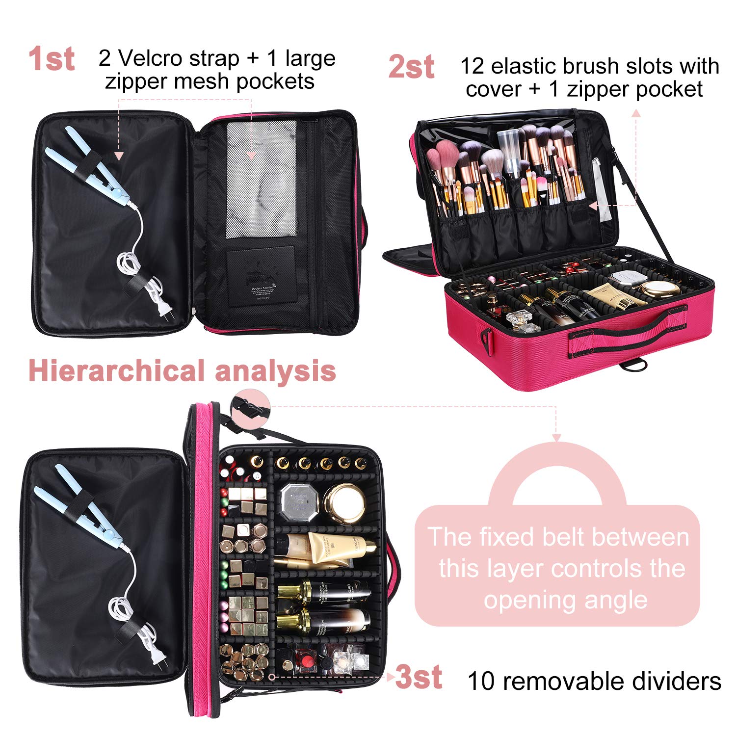 - 3-Layers Large Capacity: JOURMON large makeup bag organizer is features a 3-layers (16.5 × 12.2 × 5.5 inches). This train makeup case has enough space to store your cosmetic accessories, like lipstick, makeup brushes, palettes, etc.