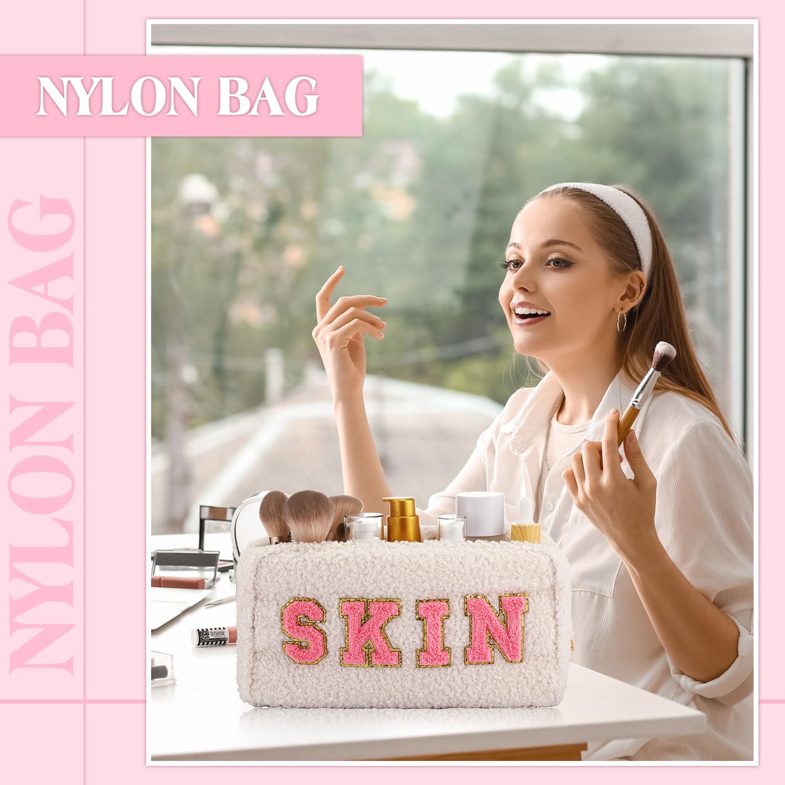 Kajaia 4 Pcs Preppy Makeup Bags Chenille Letter Stuff Bag Cute Cosmetic Pouch Cases for Women Trave Toiletry spend the night(Beige, Powder, Milk White, Pink,Grace)