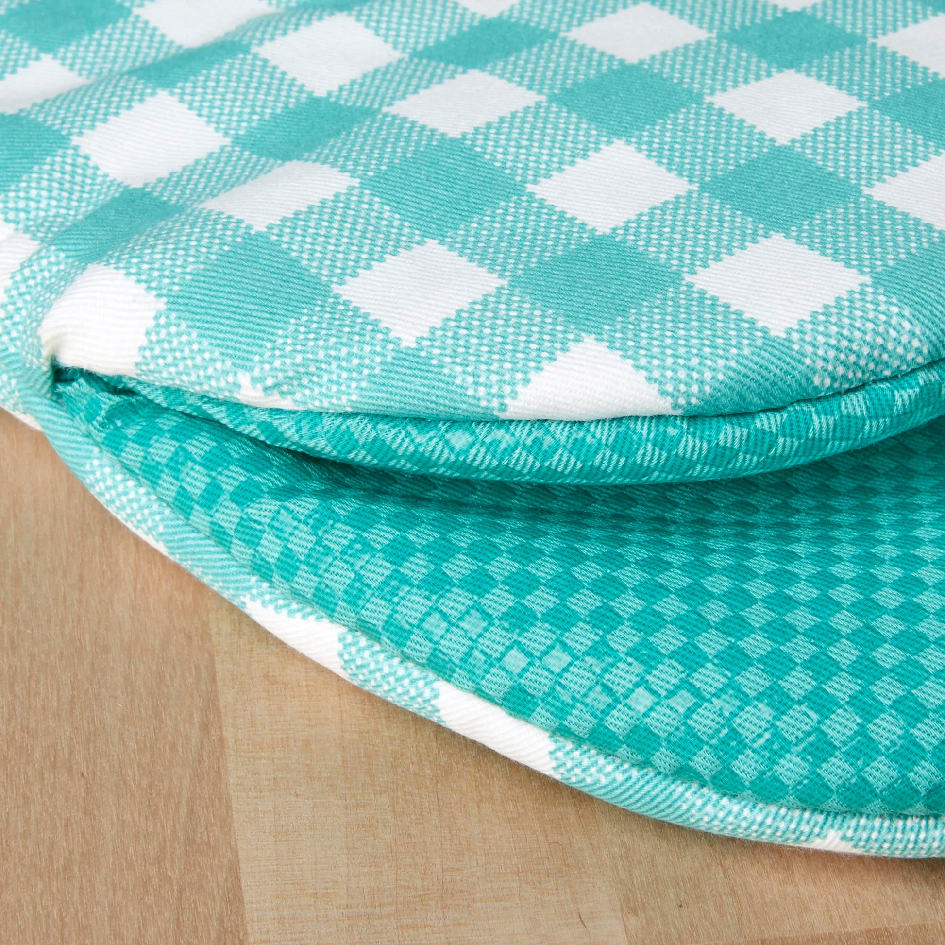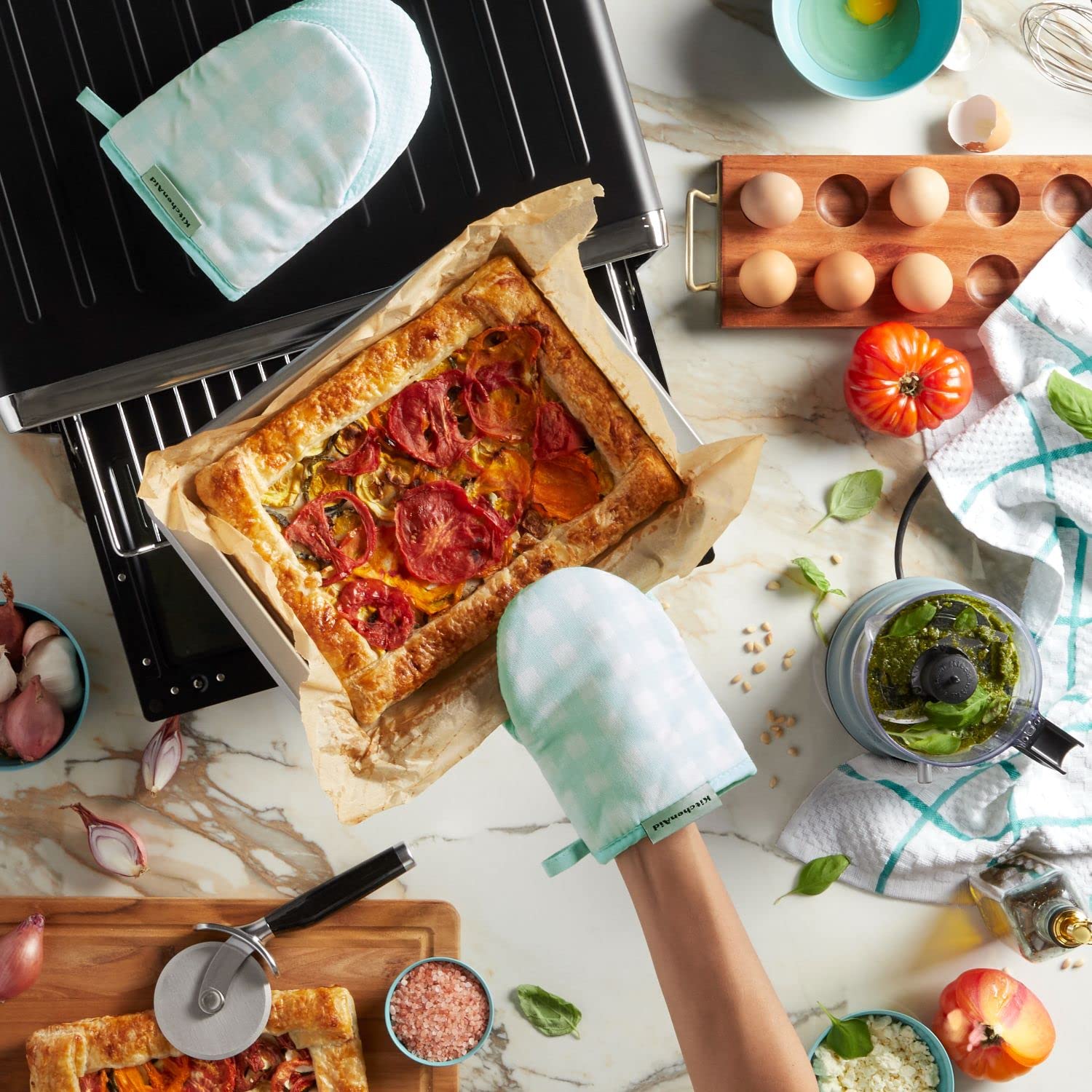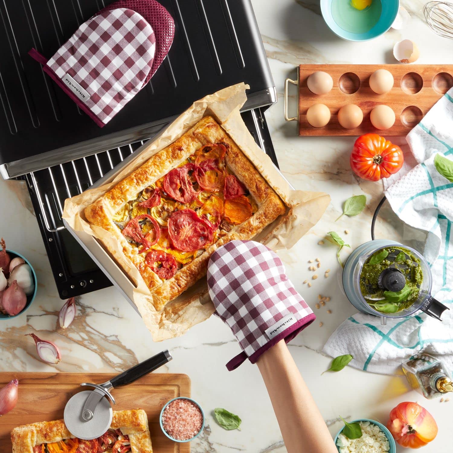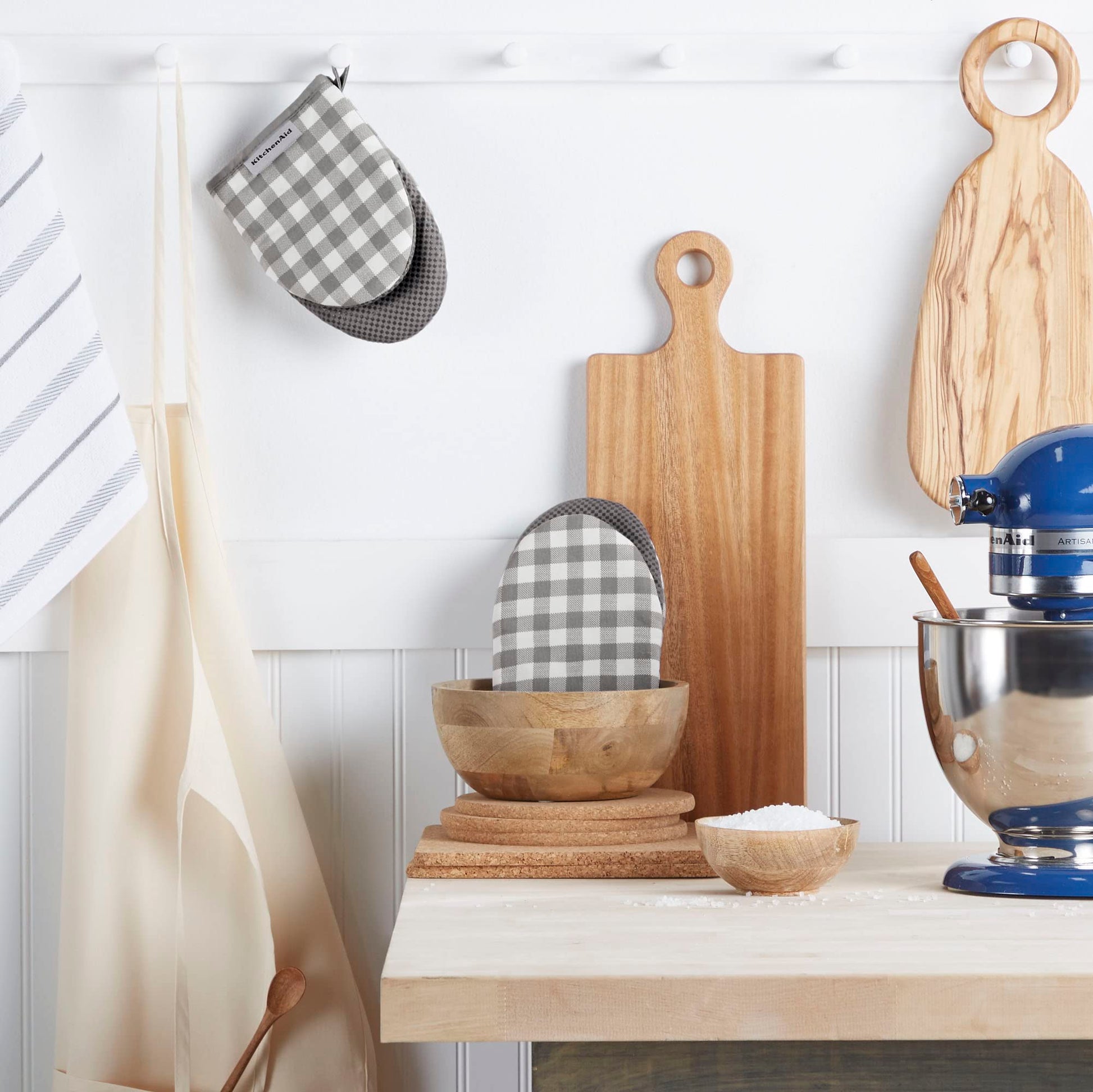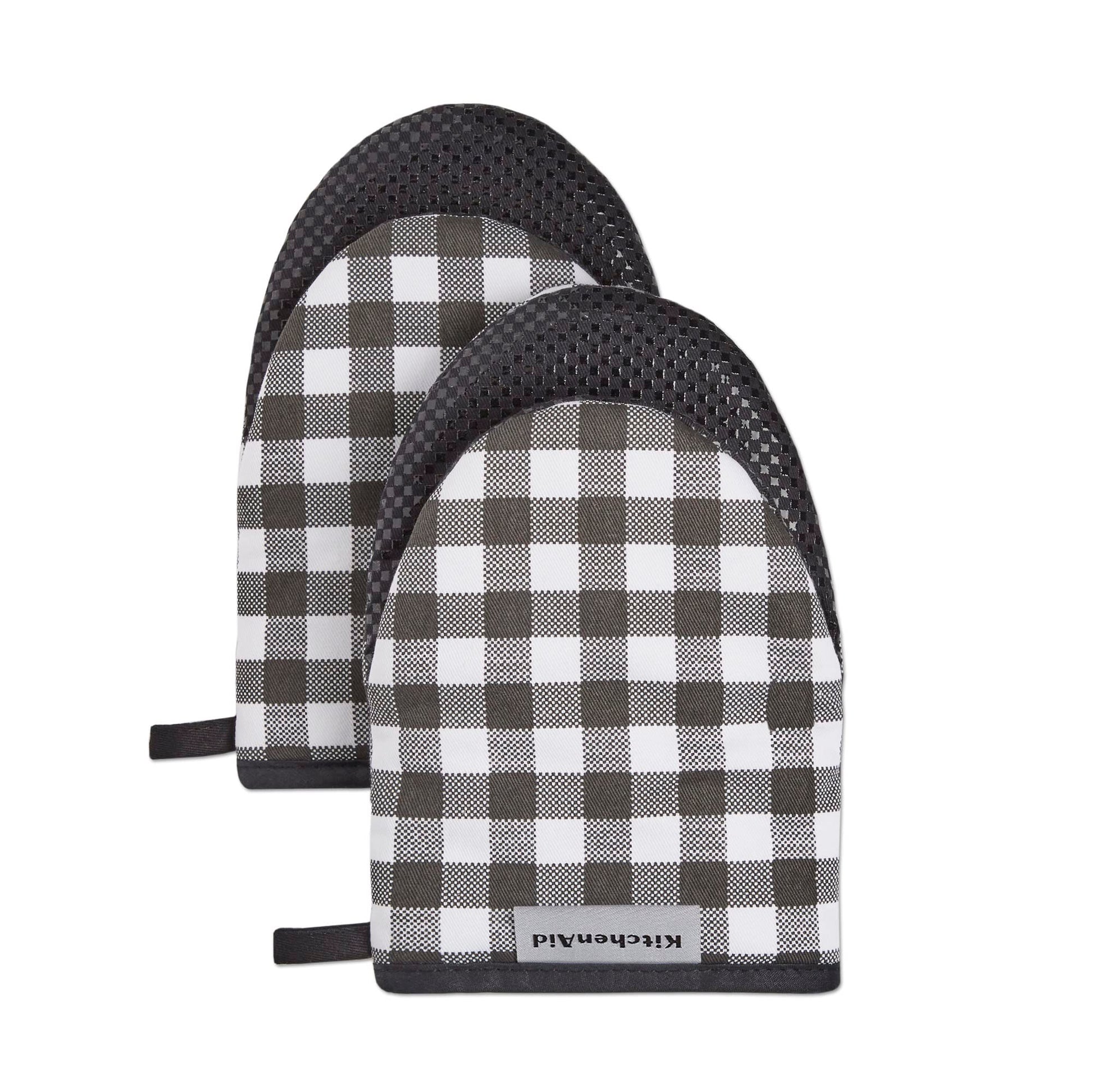 - SET OF TWO – Protect your hands while handling hot cookware with these mitts. Set includes two (2) Kitchen Aid Gingham Mini Mitts with classic checkered pattern , each measuring 5.5" W x 8" L.