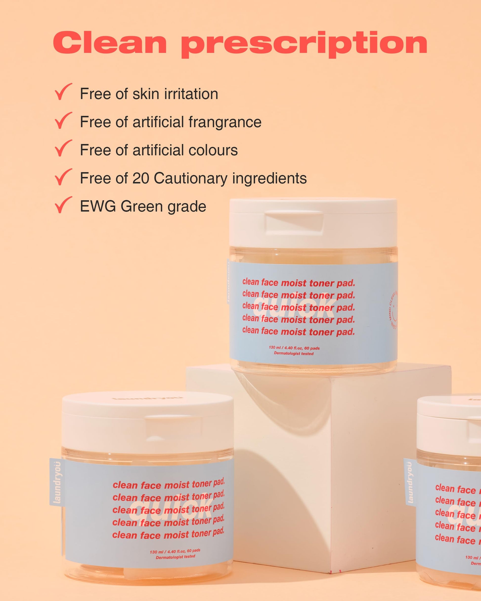 - QUICK AND EASY: Opt for Laundryou Clean Face Moist Toner Pads for a hassle-free skincare routine. These convenient pads are simple to use, save time, and provide immediate results. Enjoy more of your day with a skincare routine that's quick and effective, all in one easy-to-use toner pad.