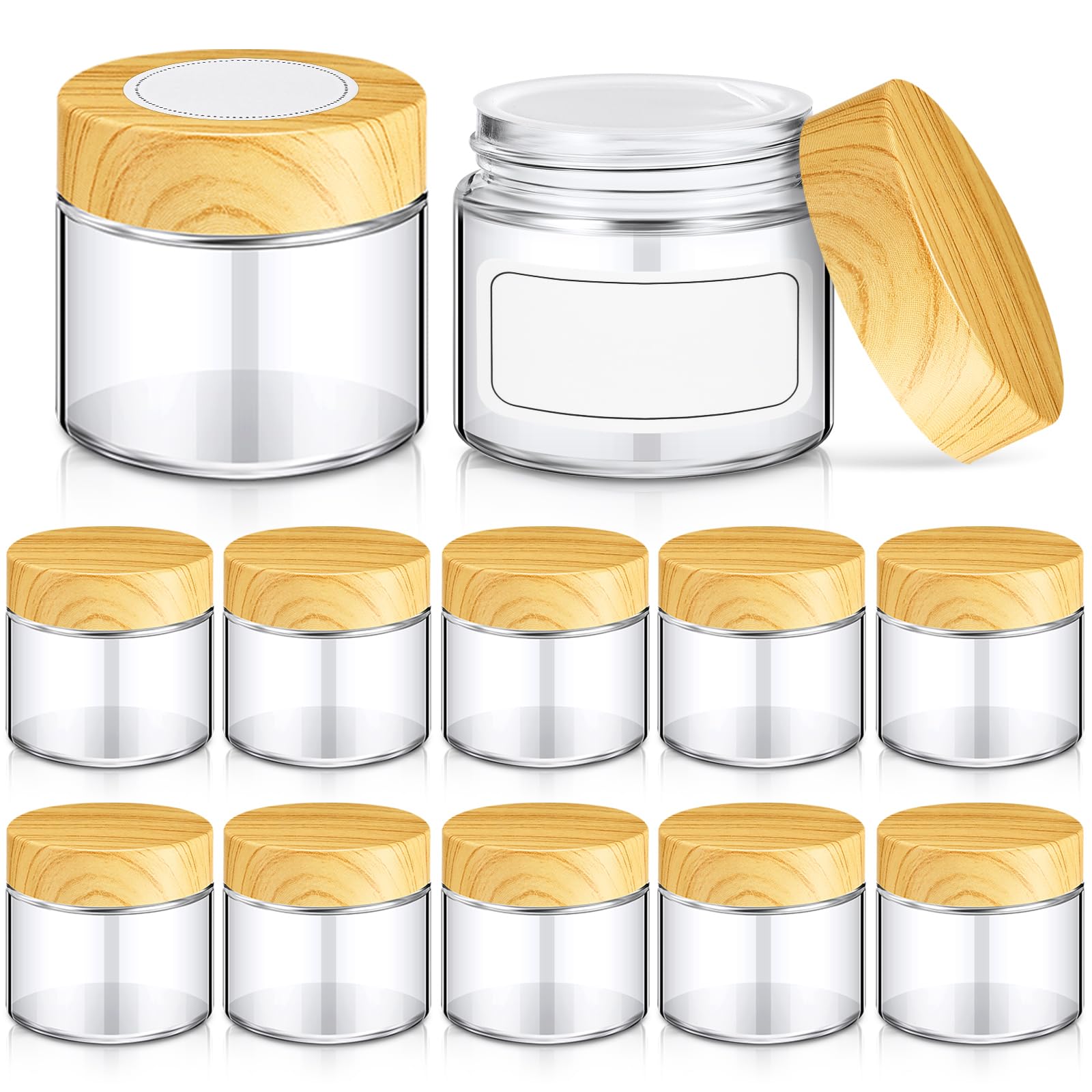 Layhit 12 Pcs Glass Jars with Lids Clear Small Jars with Plastic Woodgrain Lids, White Labels and Inner Liners Empty Round Cosmetic Containers for Creams Lotions Powder Ointments Candle Making (2 oz)
