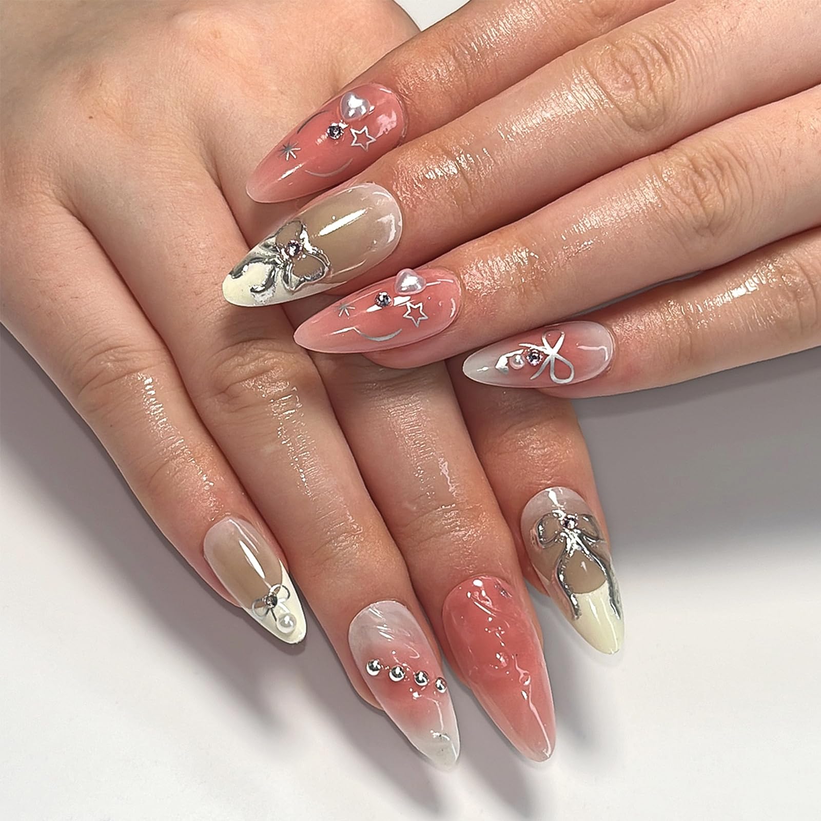 Details: pink press on nails medium almond fake nails with 3d silver bow bead pearl designs