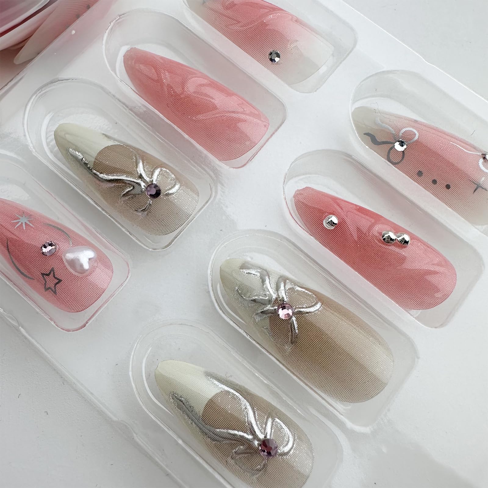 LBPEPAMZ Pink Press on Nails Medium Almond Fake Nails with 3D Silver Bow Bead Pearl Designs White Gradient French Tips Acrylic Nails False Nails Heart Full Cover Glossy Stick on Nails for Women 24Pcs