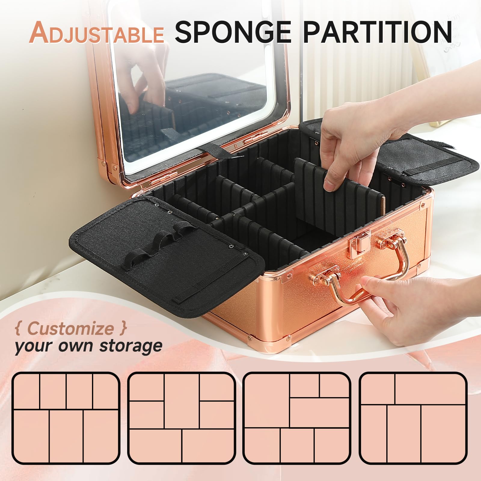 Leeora&Leekoo Makeup Box with LED Mirror & Aluminum Frame, Compact Multi-Layer Cosmetic Organizer - Portable ABS Travel Train Case for Makeup Storage(Gift for Girlfriend/Daughter) (Gold)