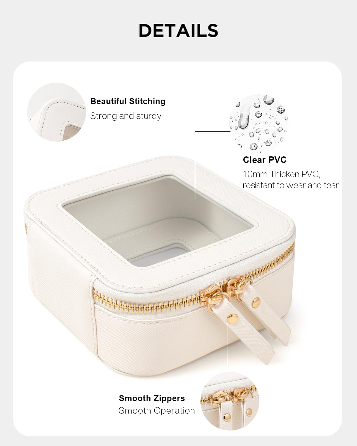 - ✈️CAR MUST HAVE ESSENTIALS CLEAR MAKEUP BAG : Large Size Measuring 9.84'' x 7.67'' x 3.14''(25cm x19.5cm x 8cm), Mini Size 5'' x 4.7'' x 2''(12.7cm x 12cm x 5cm), our clear makeup bag is elegant ,and stylish, this makeup travel organizer was designed in a minimalist boxy shape and Crafted in beautiful PU leather and finished with polished hardware, the trendy makeup bag is easy to carrying in your handbag or carry-on.