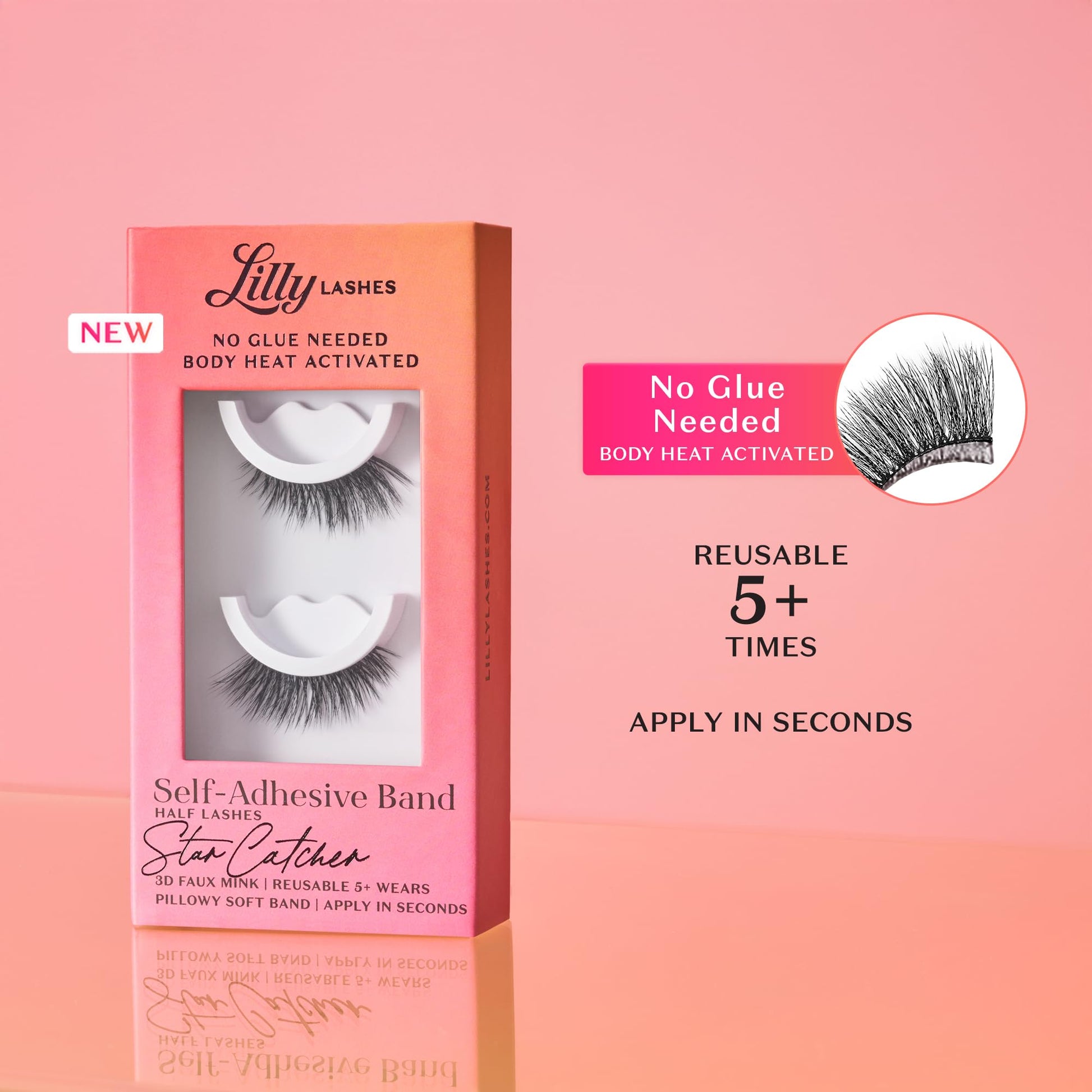 - EASY TO APPLY SELF ADHESIVE LASHES: These pre glued eyelashes allow the stickiness between the lashes and your skin to be activated by body heat. Lilly Lashes Self Adhesive Eyelashes band can be applied, positioned and repositioned in seconds without the need for messy glue or tools. The pillowy, comfortable band and lightweight feel of these lashes will make these your go-to lash and ditch the eyelash glue forever!