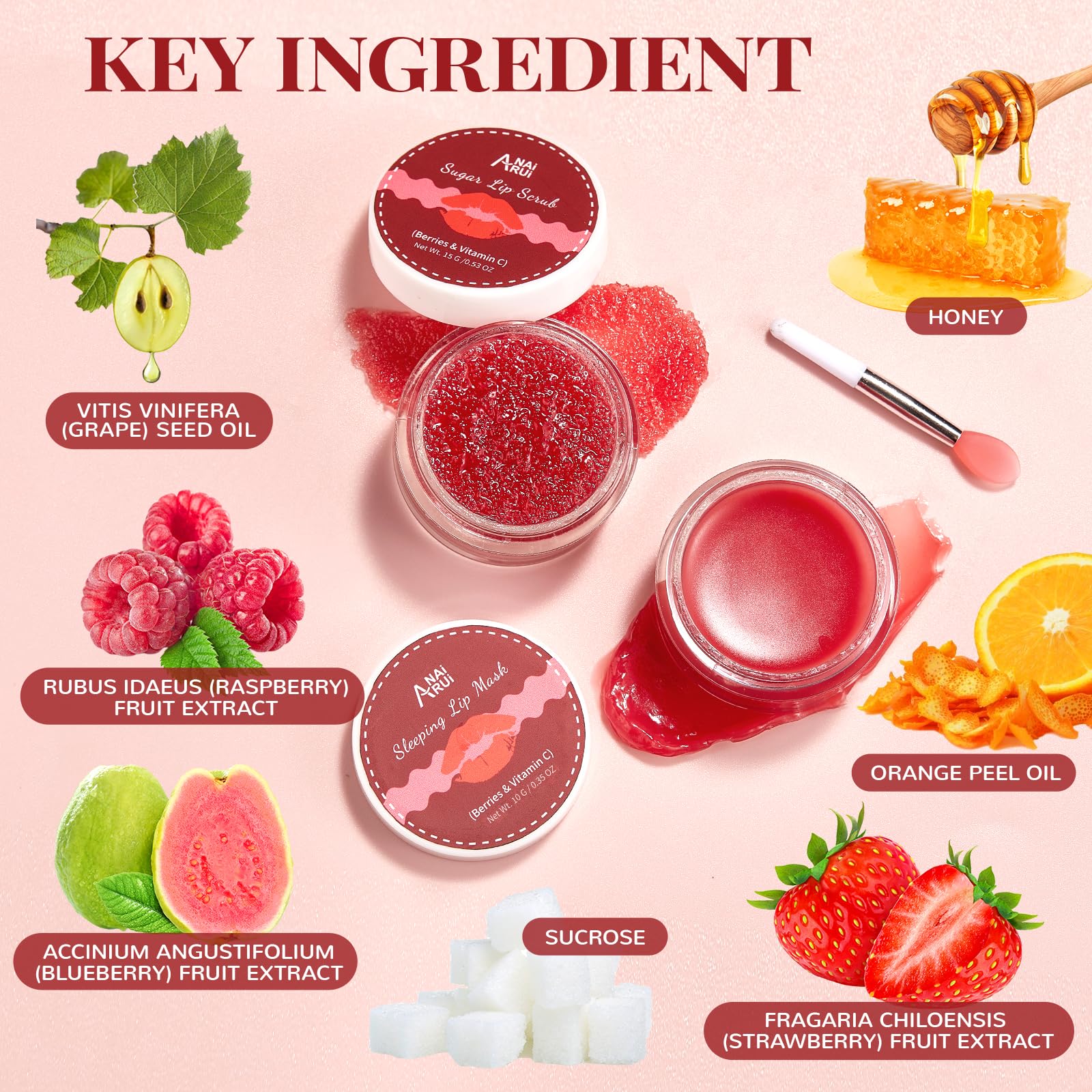 - Natural Berries & Vitamin C Lip Set--The hydrating lip mask set rich in various fruits and plants, Sugar, Strawberry, Vitamin C, Honey, Grape seed oil, Blueberry and Orange peel oil which has moisturizing and smooth propreties to leaving you plumping lips.