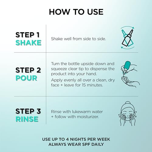 - For Best Use: Shake from side to side. Turn bottle upside down, squeeze clear tip to dispense product. Apply all over a clean, dry face & leave for 15mins. Rinse with lukewarm water. Follow with moisturizer. Apply a minimum SPF 30 sunscreen every day