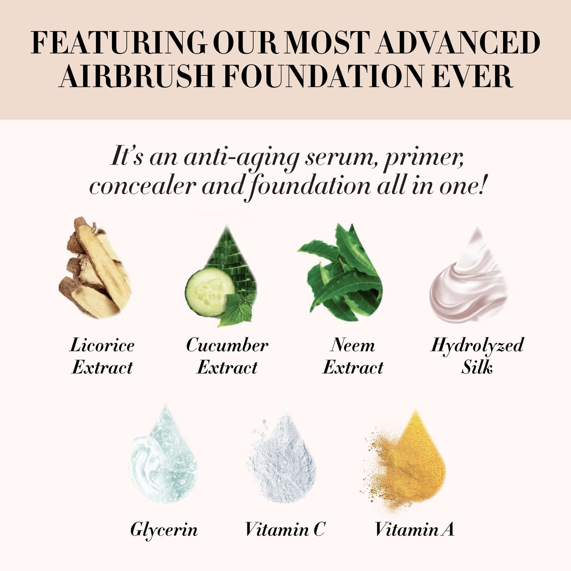 - Less Foundation, Better Results: LUMINESS Silk 4-in-1 Airbrush Foundation combines an anti-aging serum, primer, high-coverage concealer, and foundation into one product with 18-hour wear. It hydrates and provides rich nourishment for skin while reducing the appearance of fine lines, texture, and wrinkles. Includes skin-loving ingredients such as Licorice Extract, Cucumber Extract, Neem Extracts, Glycerin, Hydrolyzed Silk, Vitamin C, and Vitamin A.