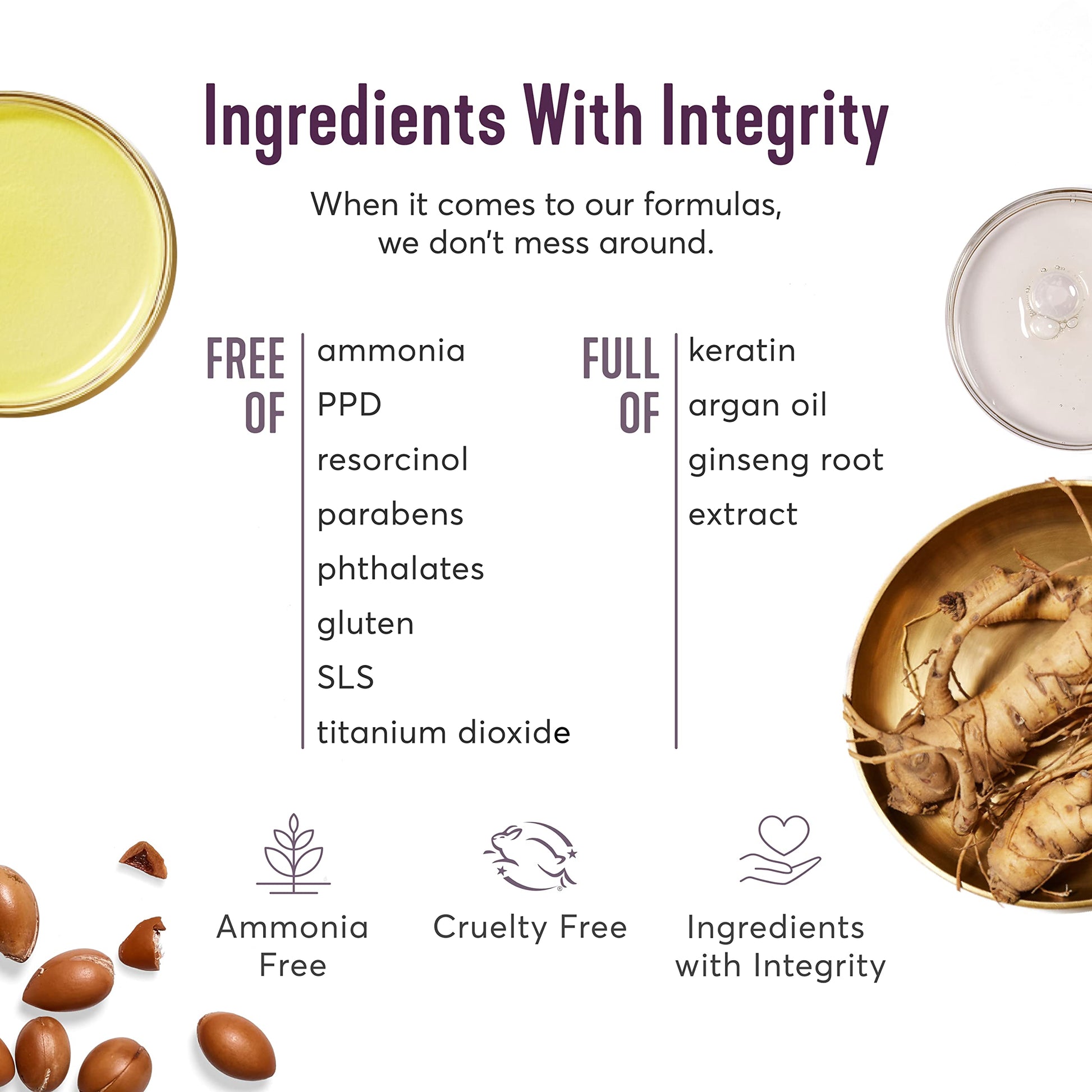- KERATIN ENRICHED HAIR COLOR: Permanent hair color is infused with hair-loving ingredients: keratin, argan oil, and ginseng root extract to leave your hair feeling healthy, conditioned, and shiny. No harsh ingredients: 100% ammonia-free, PPD-free, resorcinol-free, paraben-free, pthalates-free, SLS-free, gluten-free, titanium-dioxide-free, and cruelty-free.