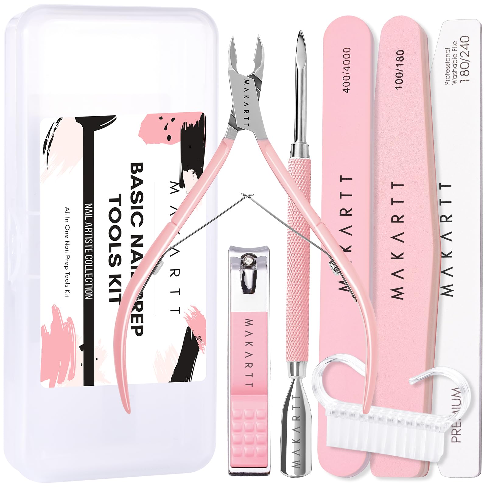 Makartt Nail File and Buffer Set, Pink Basic Prep Kit with Cuticle Clipper, Trimmer, Pusher, Brush, Manicure Care Kit for Natural and Acrylic Nails (7pcs)