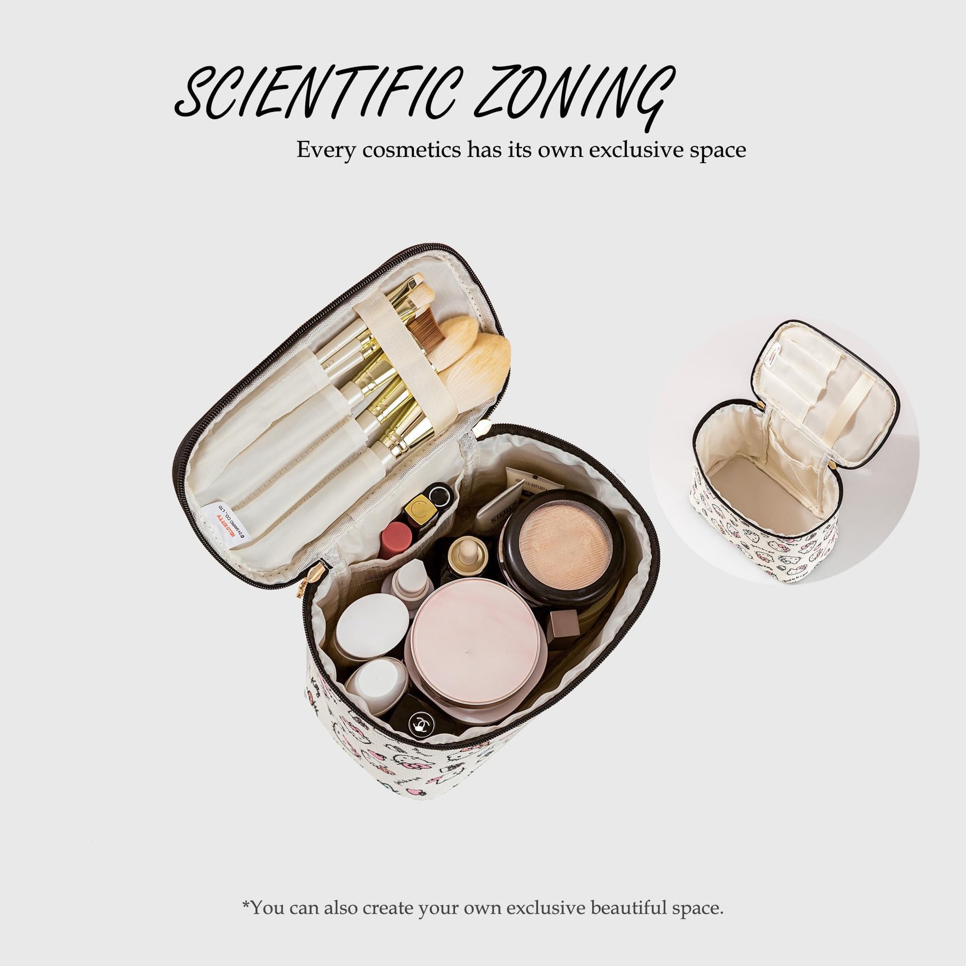 - Separate Brushes Compartment - Travel makeup bag comes with a separate space to hold your brushes and protect them from dust.The large independent space in the middle can accommodate your daily cosmetics.There is an independent side pocket inside for lipstick, small perfume, jewelry, etc, which is very practical. Size:8.7 x 4.7 x 6.3 inches