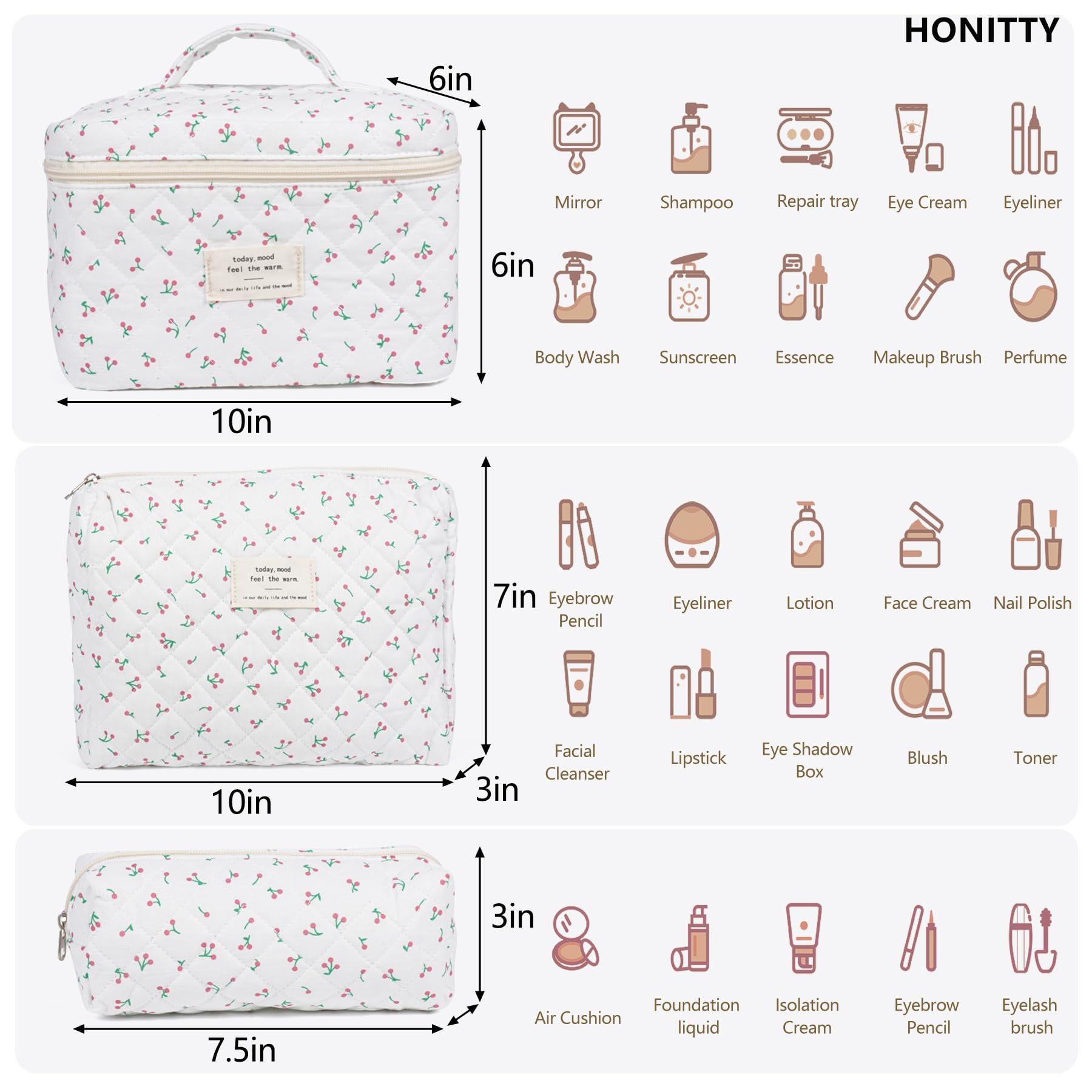 - 3 Piece Set:The floral makeup bag kit contains three different sizes of bags.10 * 6 * 6 inches, 10 * 3 * 7 inches, 7.5 * 2.3 * 3 inches; The different sizes of the bag allow you to sort and organise different items. It can also meet your needs for different occasions
