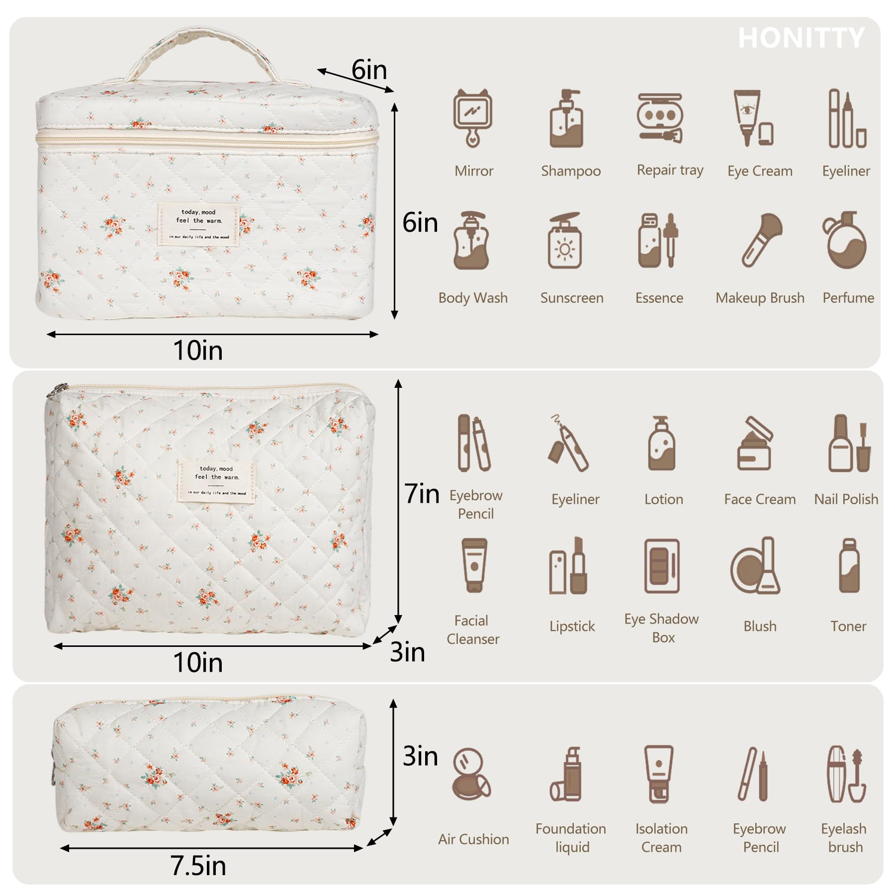 - 3 Piece Set:The floral makeup bag kit contains three different sizes of bags.10 * 6 * 6 inches, 10 * 3 * 7 inches, 7.5 * 2.3 * 3 inches; The different sizes of the bag allow you to sort and organise different items. It can also meet your needs for different occasions