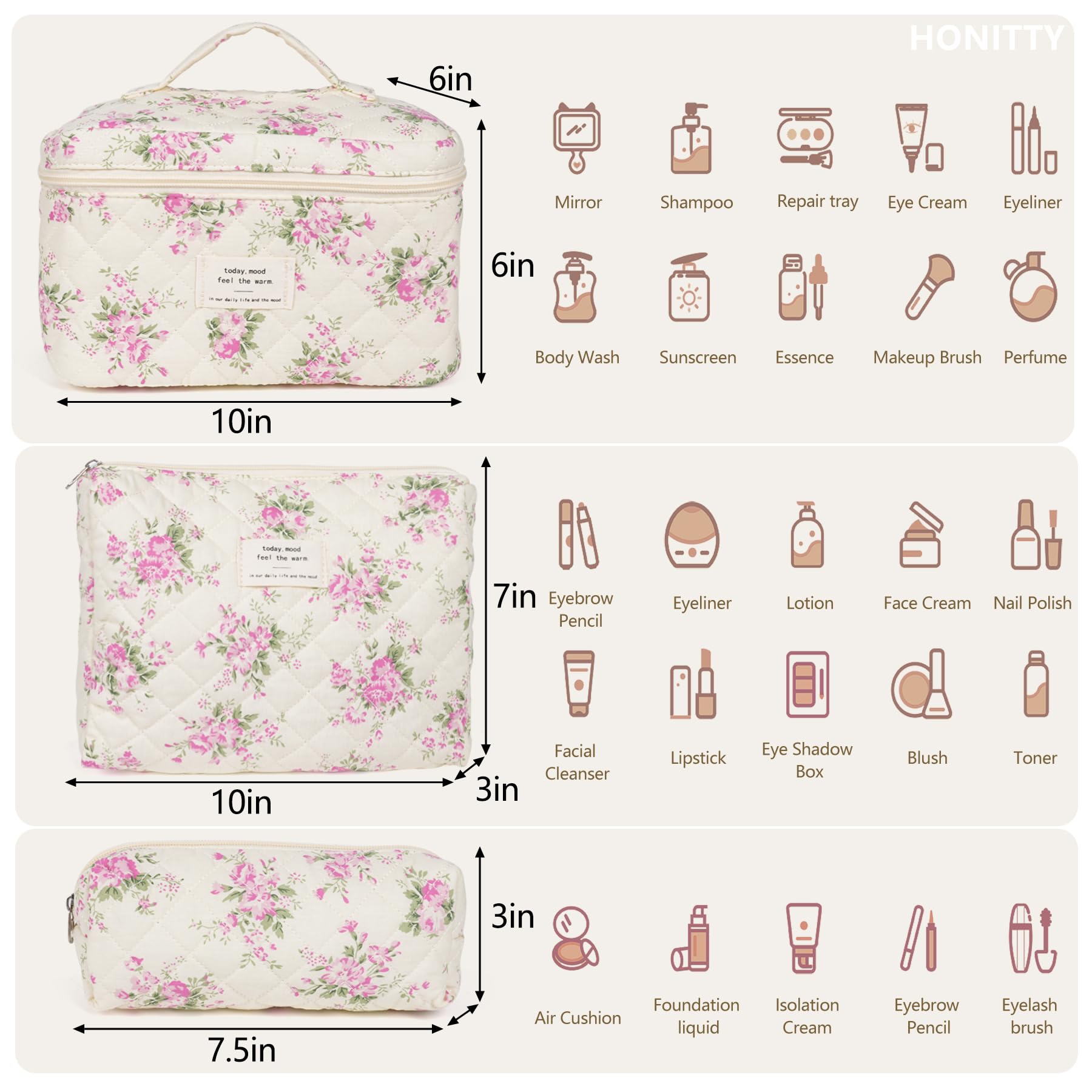 Makeup Bag,Quilted Cosmetic Bags,Large Floral Make Up Organize bag,Makeup Bag Set for Women,Flower Travel Toiletry Bag